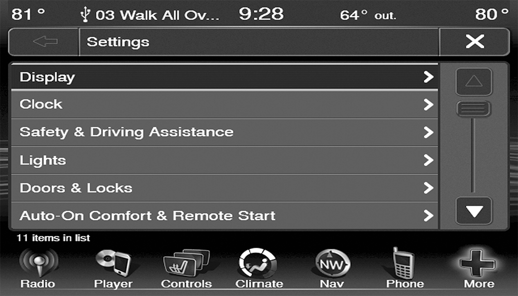 Press the More button on the touchscreen to access additional options. Options available such as Settings and SiriusXM® Travel Link (if equipped) can be accessed by pressing the corresponding button in the More Menu.