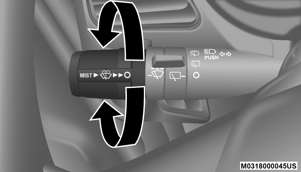 The front wipers are operated by rotating a switch, located at the end of the lever. For information on using the rear window wiper/washer, refer to “Rear Window Wiper/Washer” in this section.