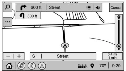 When approaching a maneuver, the map will automatically zoom in to show both the vehicle icon and the upcoming maneuver to give a better view of the maneuver. Once the maneuver is complete, the system will zoom back to the previous zoom level.