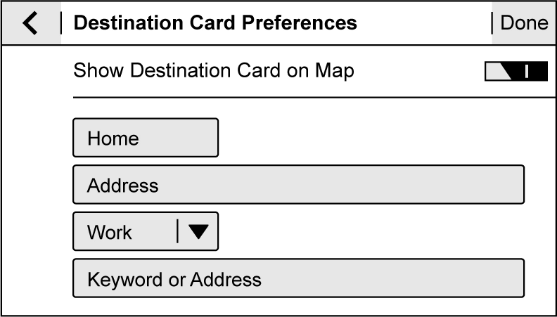 From the Nav application, set up Home and Work addresses to enable one-touch navigation. To set up Home and Work addresses, touch A and select Settings, then Map and Navigation Settings, and then Destination Card Preferences. Show My Places on Map should be on by default.