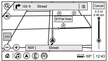 When reaching a densely populated destination and the system determines that parking may be limited, the system will attempt to display nearby parking destinations with pricing information,