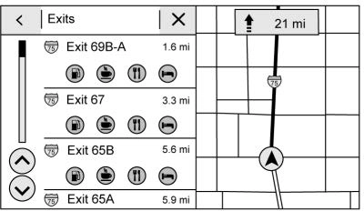 While traveling on roads with designated exits, an Exit list may be available. The Exit list displays the exit number, distance to the