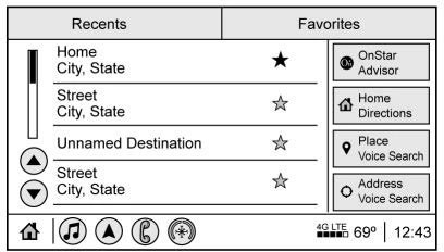 If equipped, after touching the Turn-by-Turn Directions icon, select destinations from Recents or Favorites. Recents or Favorites will be empty if this is the first use. To find new locations, touch OnStar Advisor, Home Directions, Place Voice Search, or Address Voice Search.