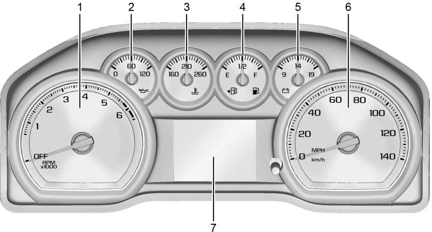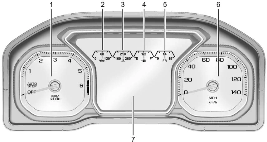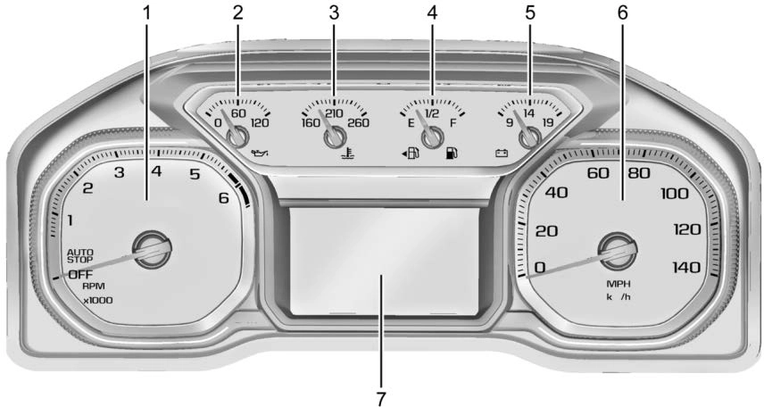 When the engine is running, this gauge shows the condition of the charging system. The gauge can transition from a higher to lower or a lower to higher reading. This is normal. If the vehicle is operating outside the normal operating range, the charging system light comes on. See Charging System Light 0 114. The voltmeter gauge may also read lower when in fuel economy mode.