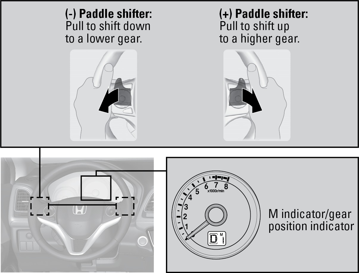 When the shift lever is in S: The vehicle goes into manual shift mode, and the M indicator and gear number come on. When the vehicle comes to a stop, it automatically shifts down into 1st gear. You can pull away only in 1st gear. If the vehicle speed increases and the engine speed approaches the tachometer's red zone, the transmission automatically shifts up.