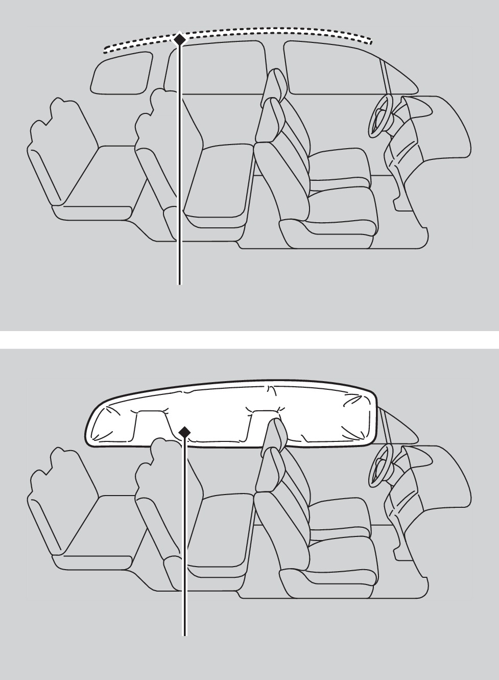 Two side curtain airbags, one for each side of the vehicle. The airbags are stored in the ceiling, above the side windows. The front and rear pillars are marked SIDE CURTAIN AIRBAG. |