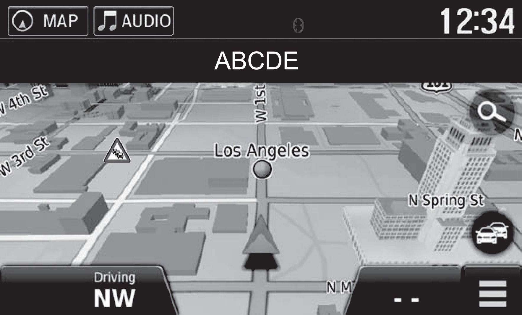 A real-time navigation system uses GPS and a map database to show your current location and help guide you to a desired destination. You can operate the system using voice commands or the system controls.
