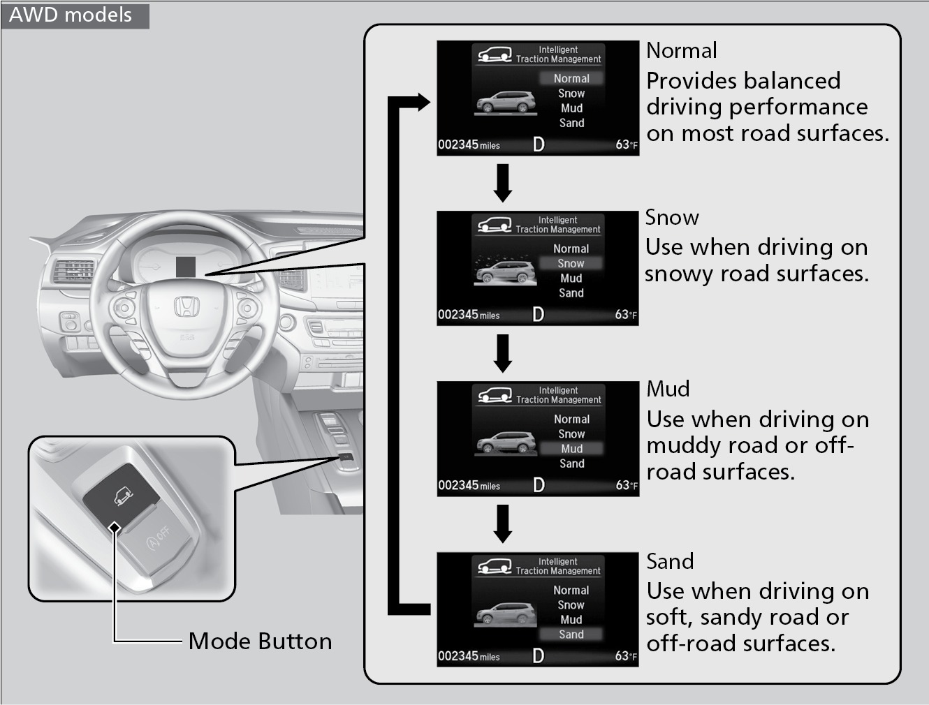 Press the Mode button to select one of four appropriate modes. The mode you select appears on the MID.