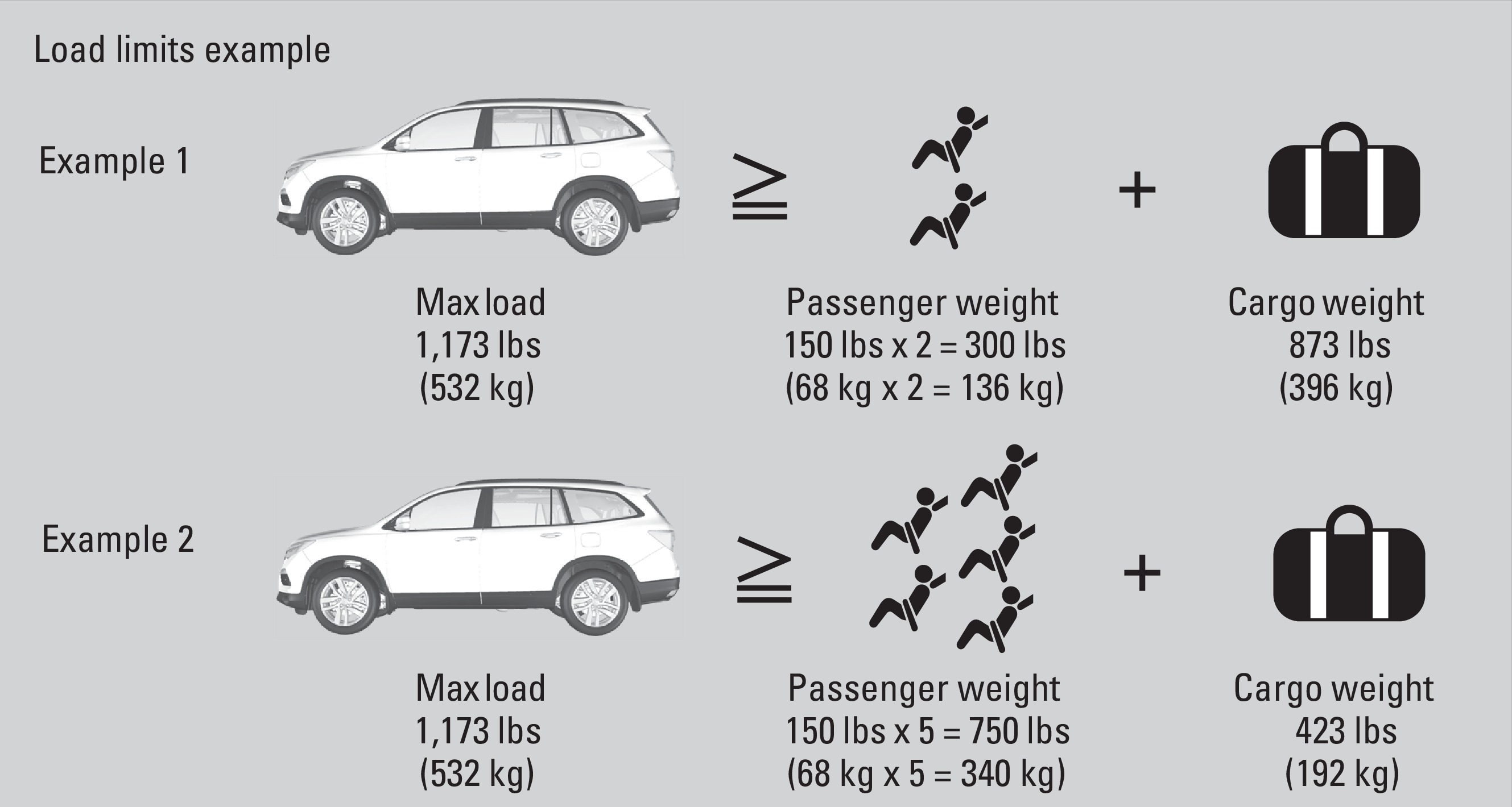 - The resulting figure equals the available amount of cargo and luggage load capacity. For example, if the "XXX" amount equals 1,400 lbs. and there will be five 150 lb. passengers in your vehicle, the amount of available cargo and luggage load capacity is 650 lbs. (1,400 - 750 (5 x 150) = 650 lbs.)