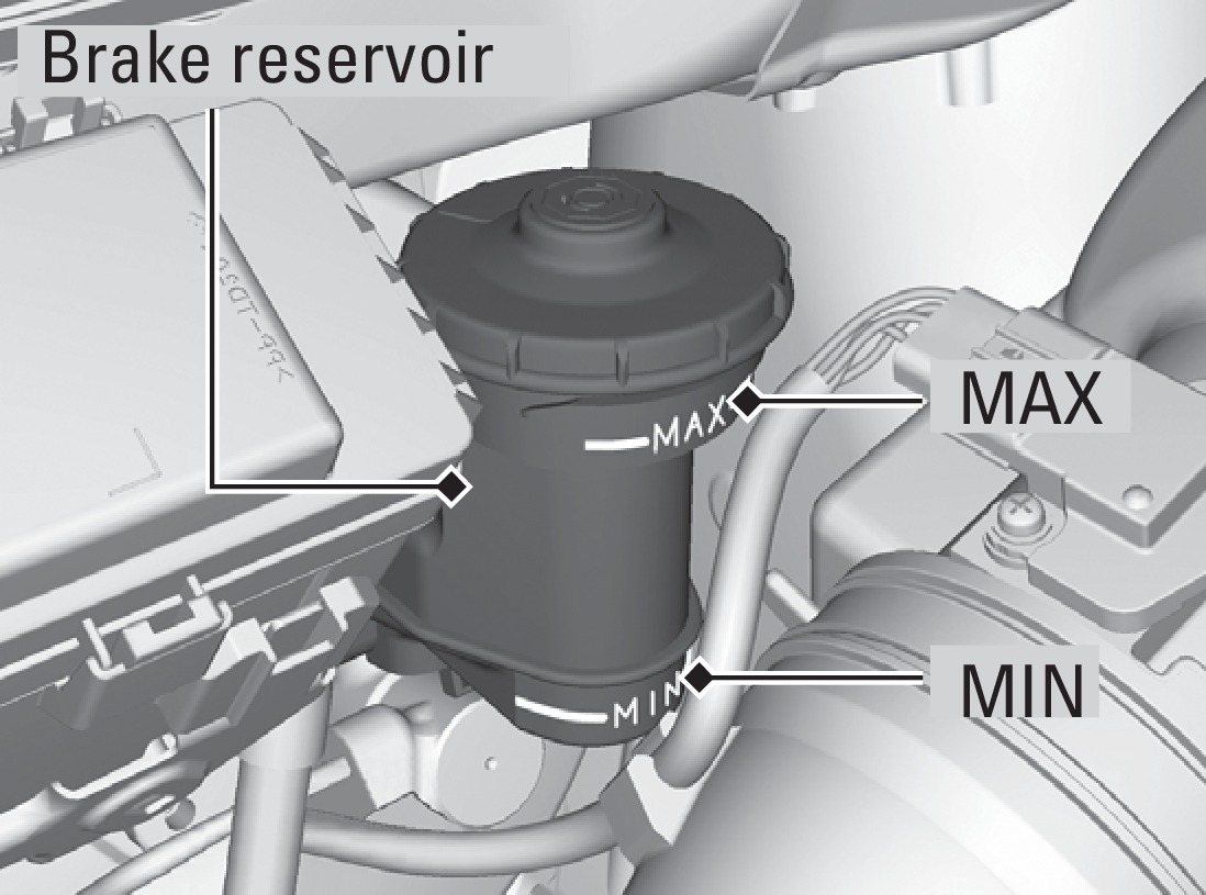 The fluid level should be between the MIN and MAX marks on the side of the reservoir. We recommend using Honda Heavy Duty Brake Fluid DOT 3.