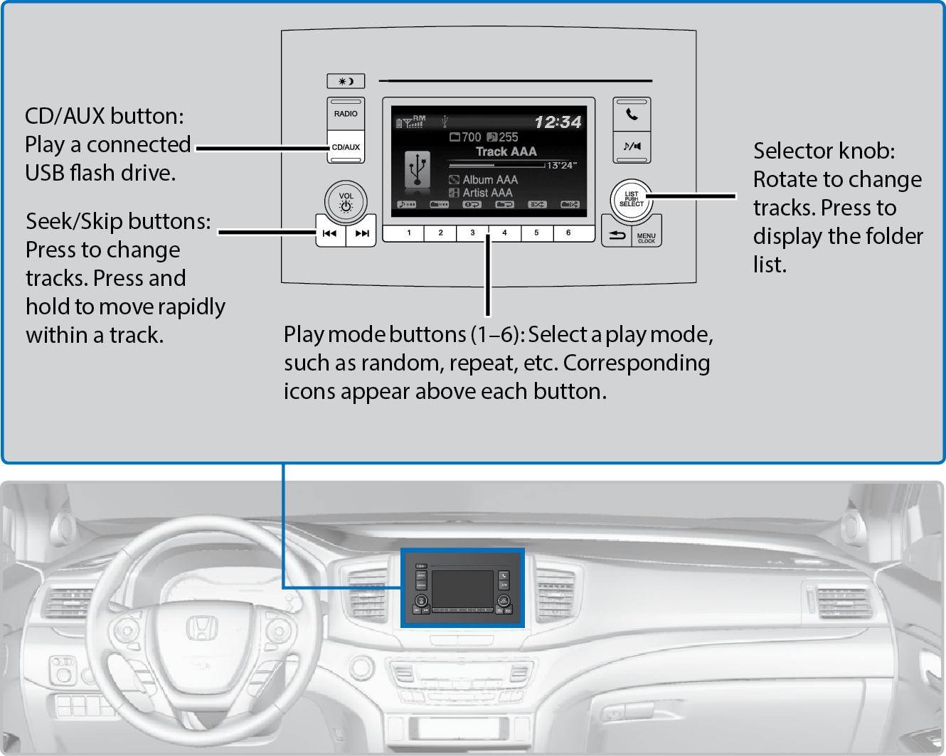 Play and operate a USB flash drive through the vehicle's audio system. Connect your device (see "Basic Audio Operation").