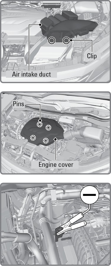 Turn off the power to electric devices, such as audio and lights. Turn off the engine, then open the hood.