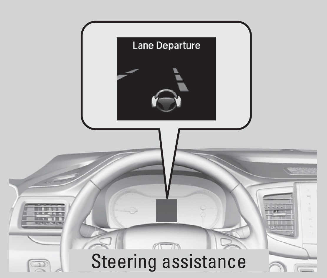 A Lane Departure message appears on the MID, and the steering wheel vibrates. Steering torque is also applied to help keep your vehicle within your driving lane. Take appropriate action to stay within your driving lane.