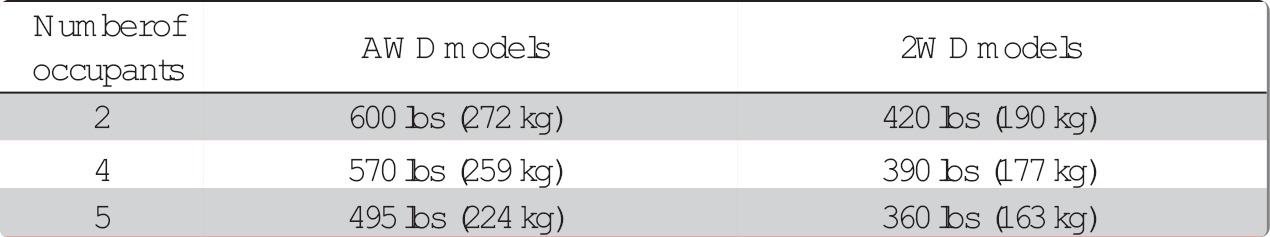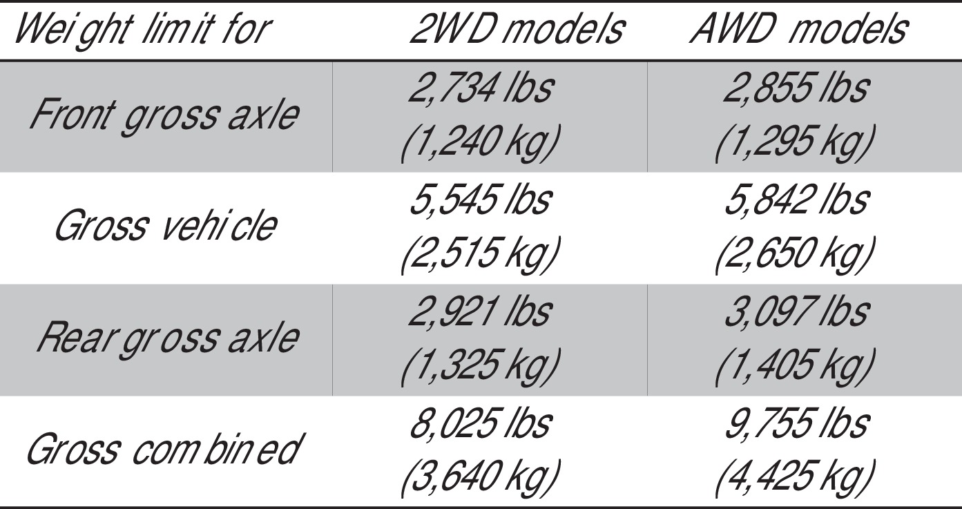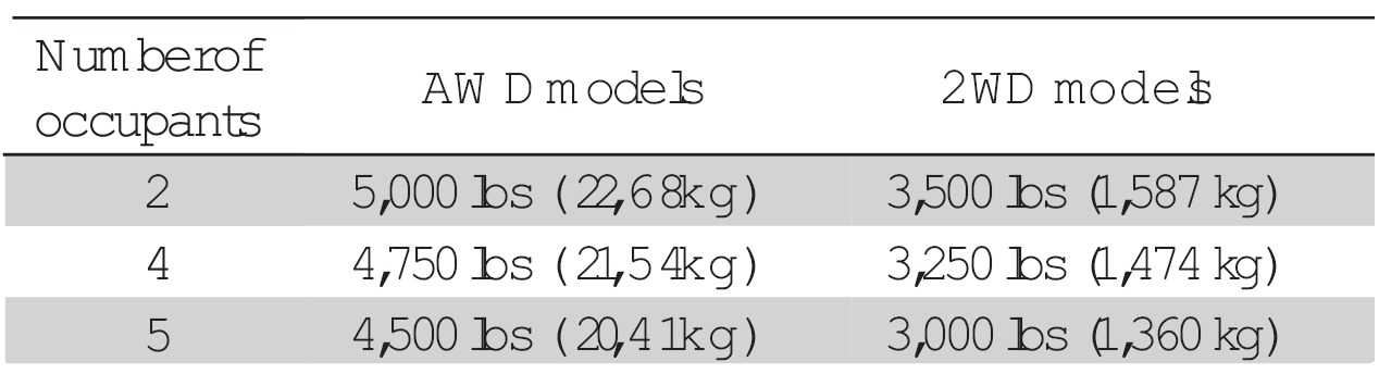 Do not exceed the maximum allowable weight of the trailer, cargo, and everything in or on it shown in the table below. Towing loads in excess of this can seriously affect vehicle handling and performance and can damage the engine and drivetrain.