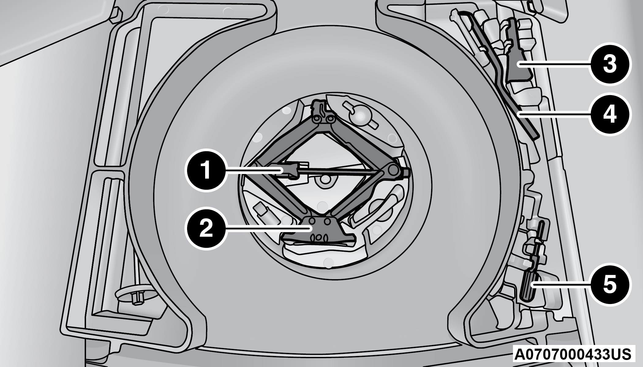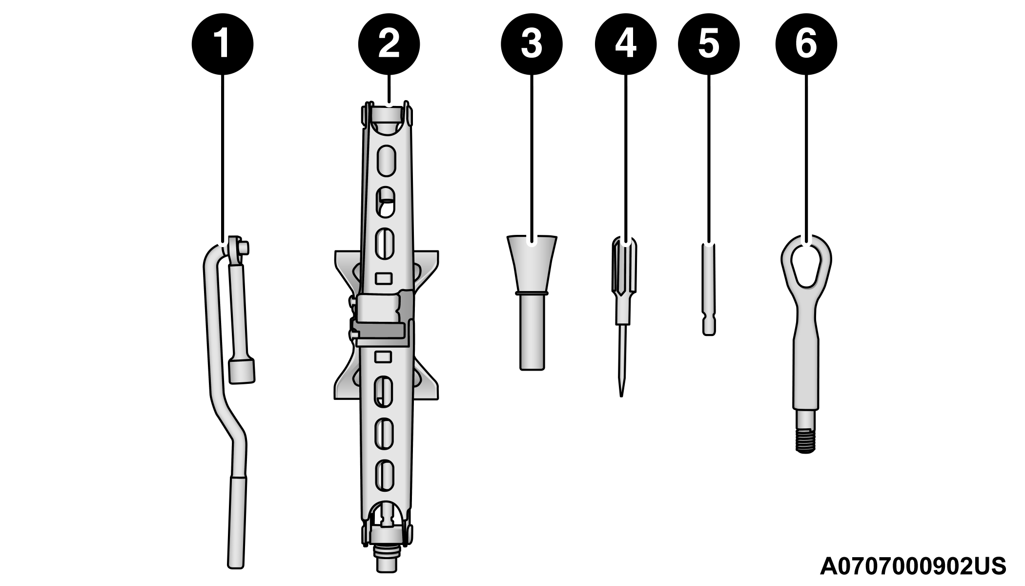 1 — Wheel Bolt Wrench 2 — Jack 3 — Emergency Funnel 4 — Screwdriver 5 — Alignment Pin 6 — Tow Eye (If Equipped)
