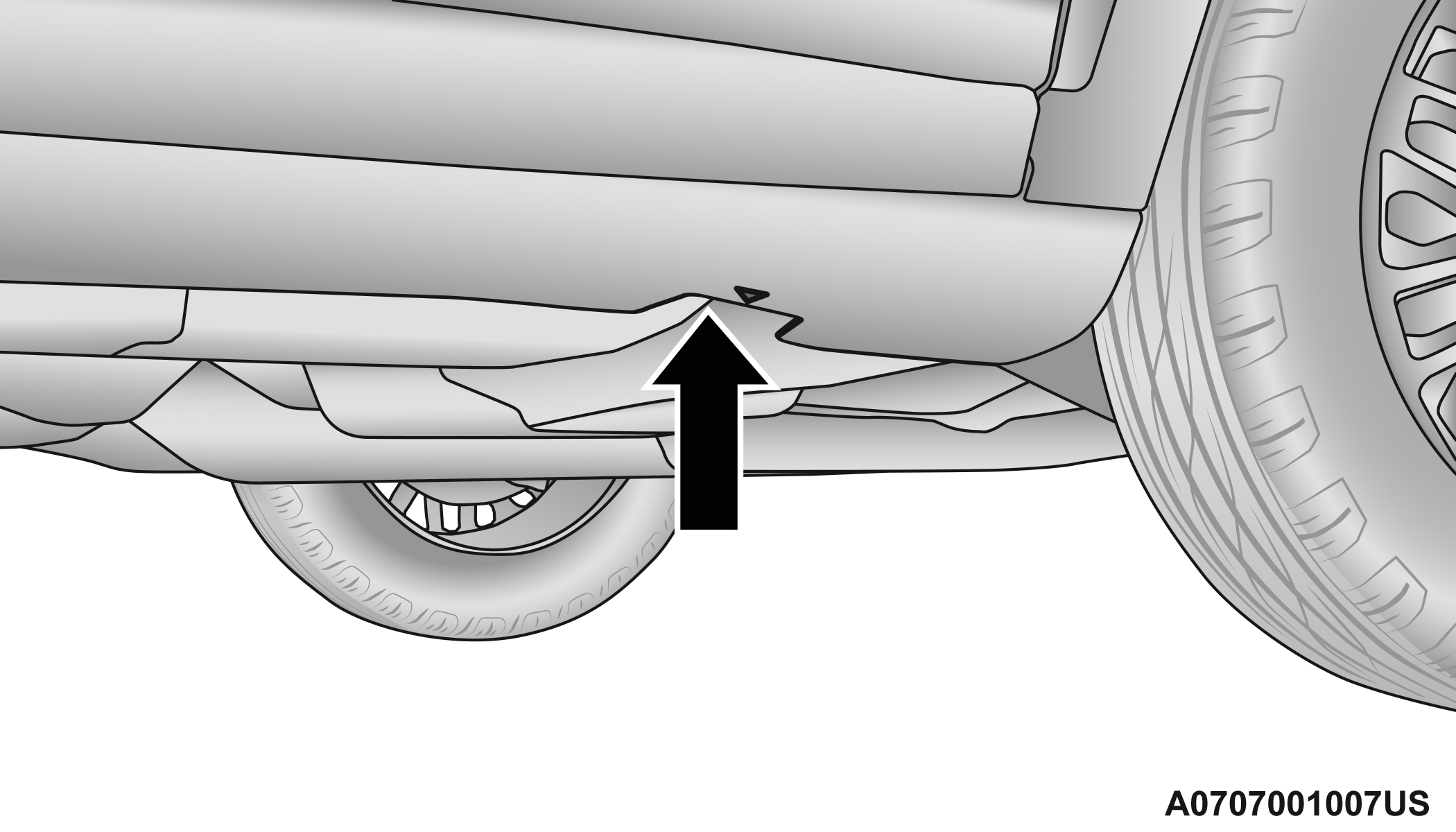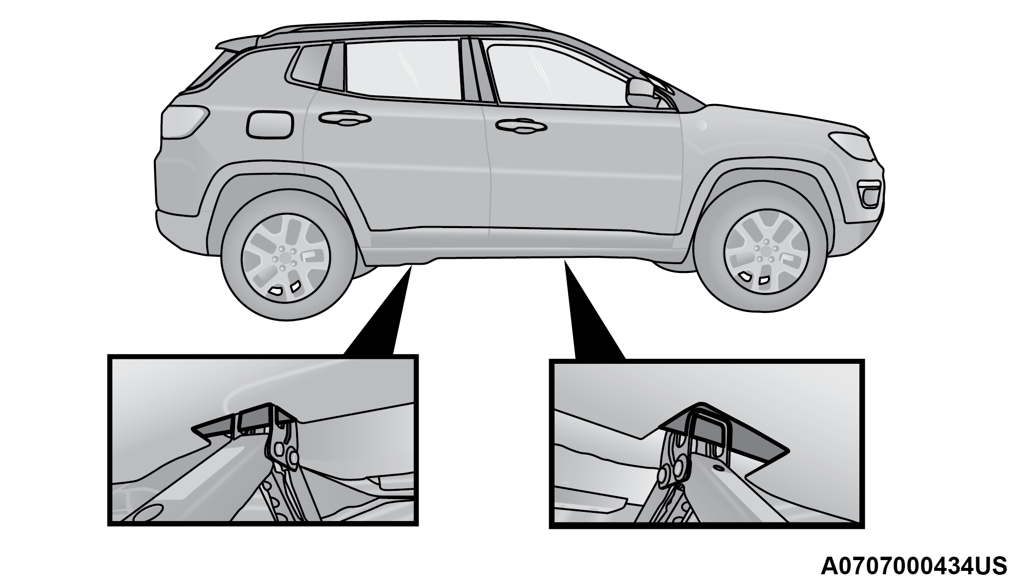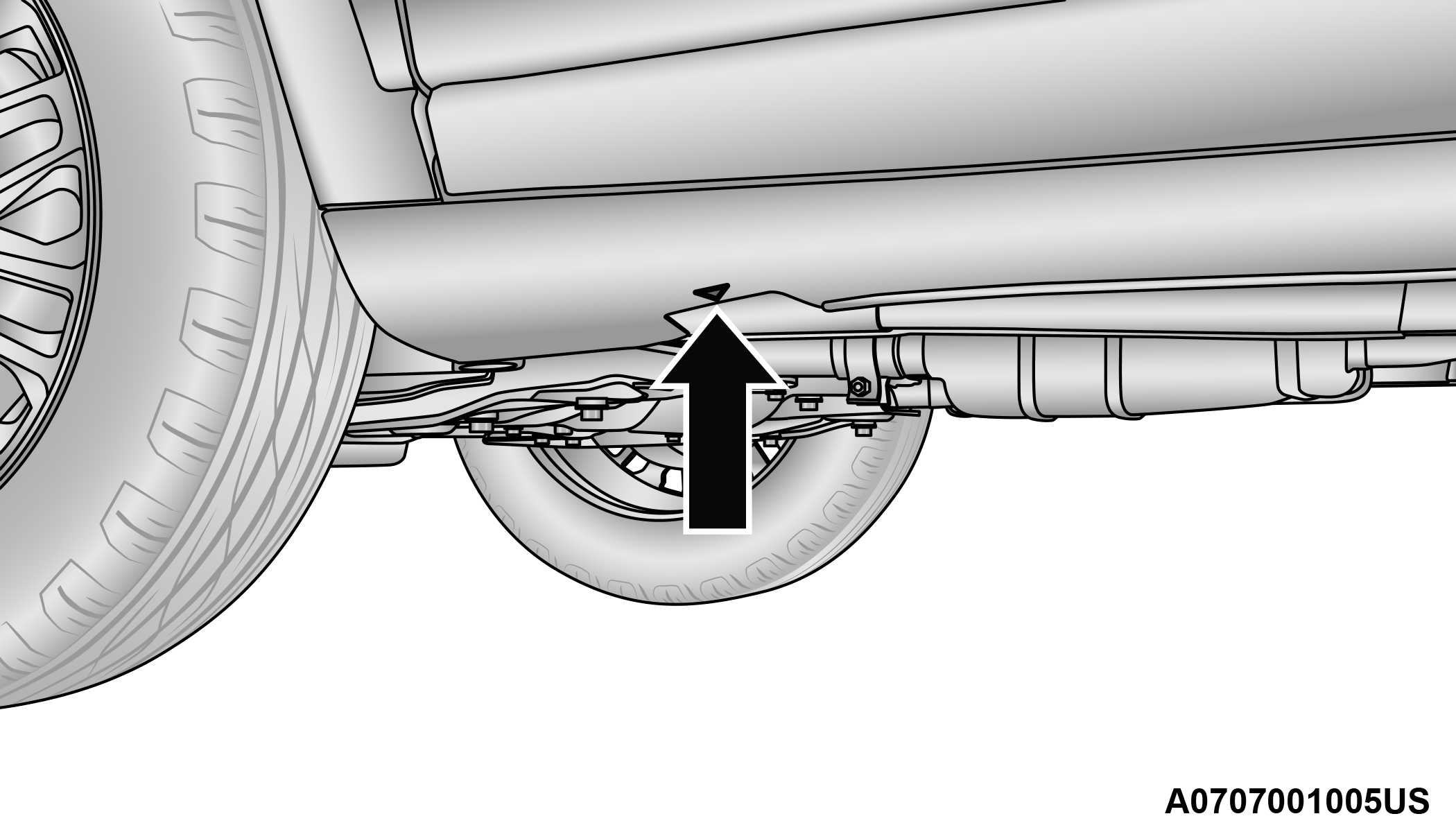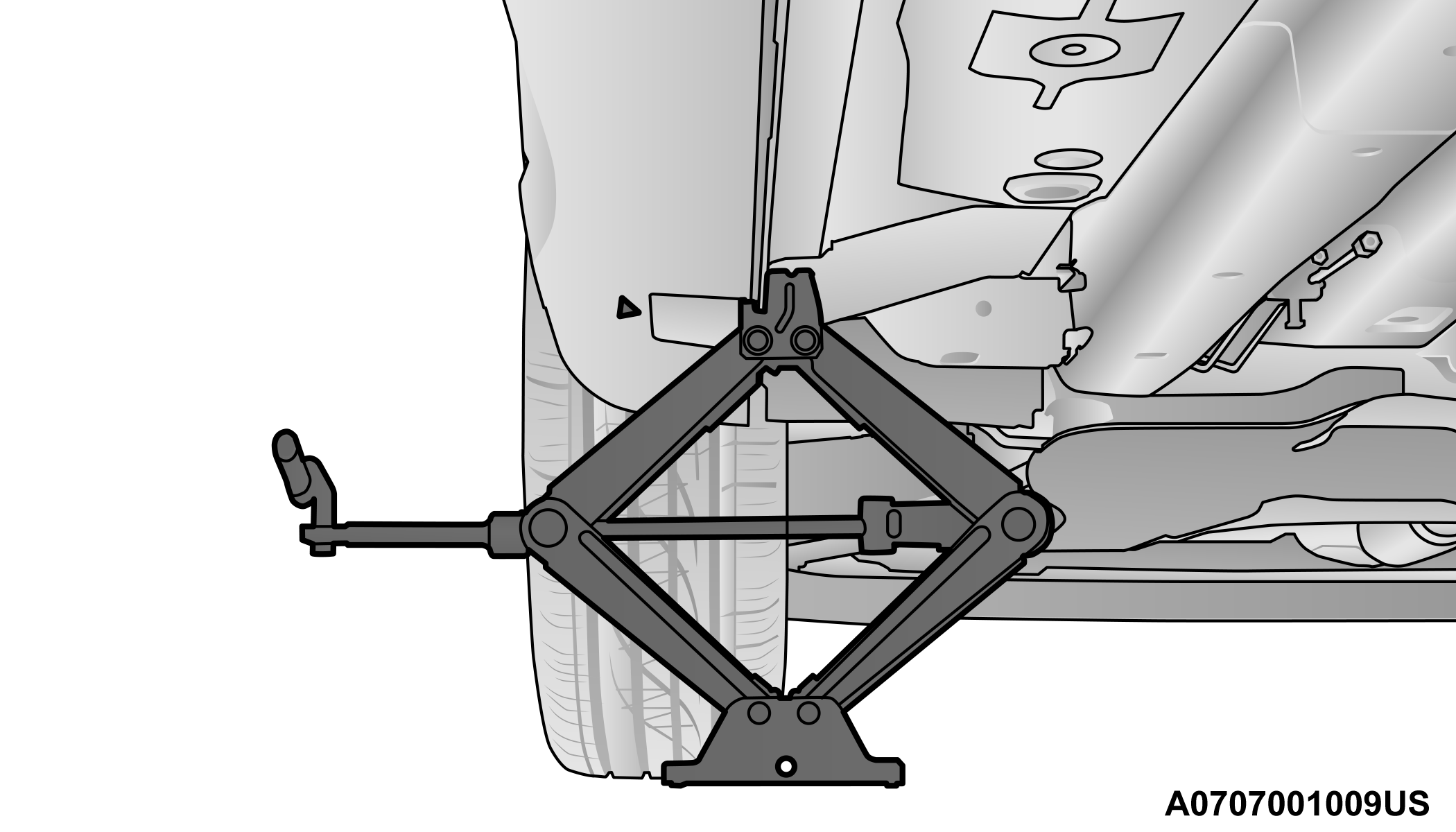 Jack lifting points can be identified by a triangular symbol on the outer rocker panel. Place the jack underneath the lift area that is closest to the flat tire. Turn the jack screw clockwise to firmly engage the jack saddle with the lift area of the sill flange, centering the jack saddle inside the cutout in the sill cladding.