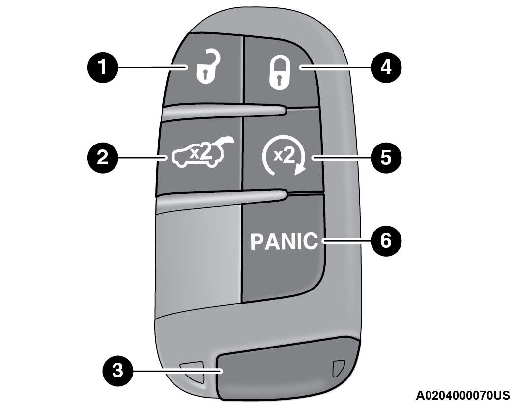 The keyless ignition key fob supports Passive Entry, Remote Keyless Entry (RKE), Keyless Enter ‘n Go™ (if equipped), Remote Start (if equipped), and remote power liftgate operation. The keyless ignition key fob supports vehicles equipped with a START/STOP ignition button. The keyless ignition key fob also includes an emergency key, which is stored in the rear of the key fob.