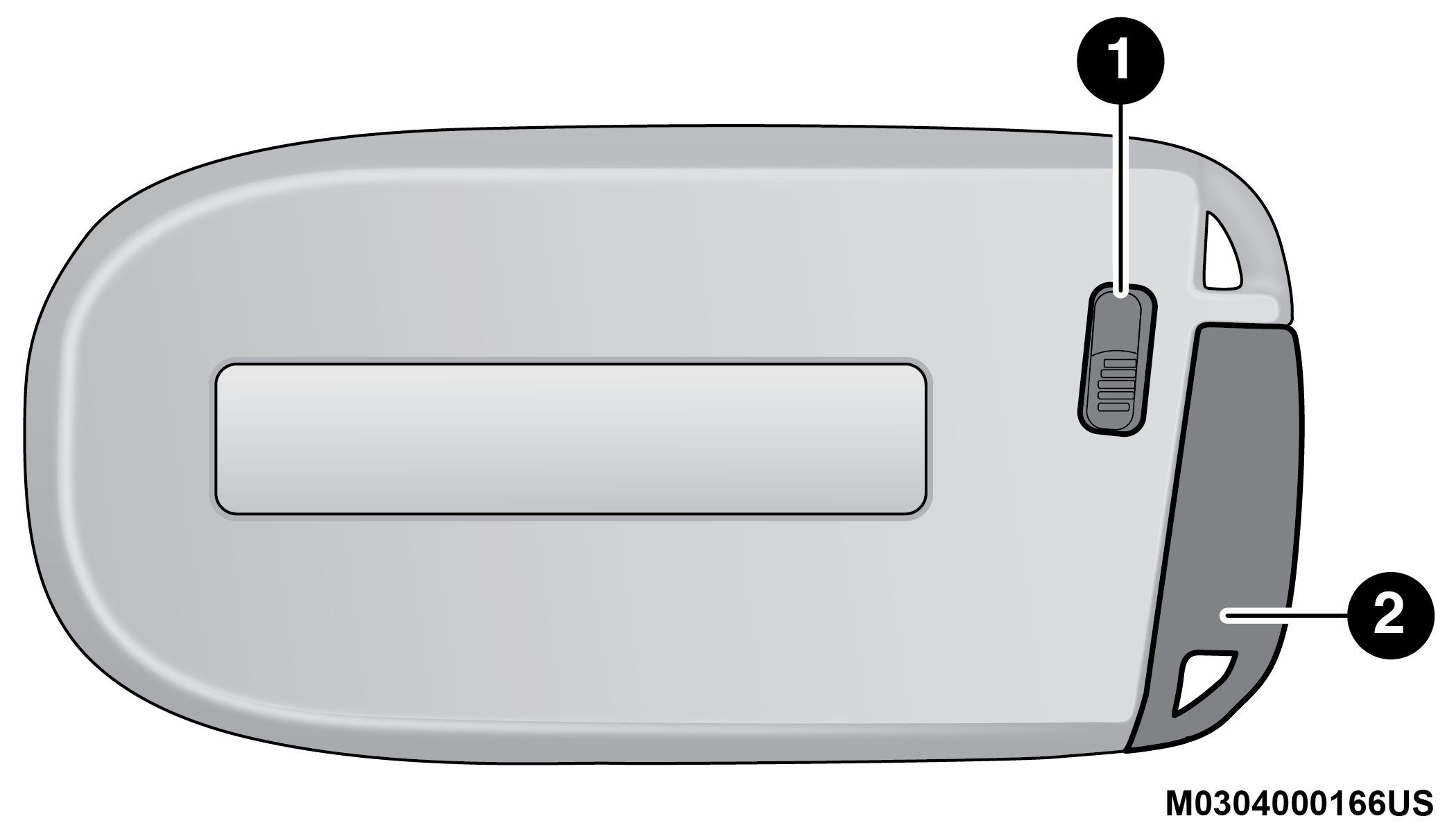 Remove the emergency key (2) by sliding the emergency key release (1) on the back of the key fob and pulling the emergency key out with your other hand.