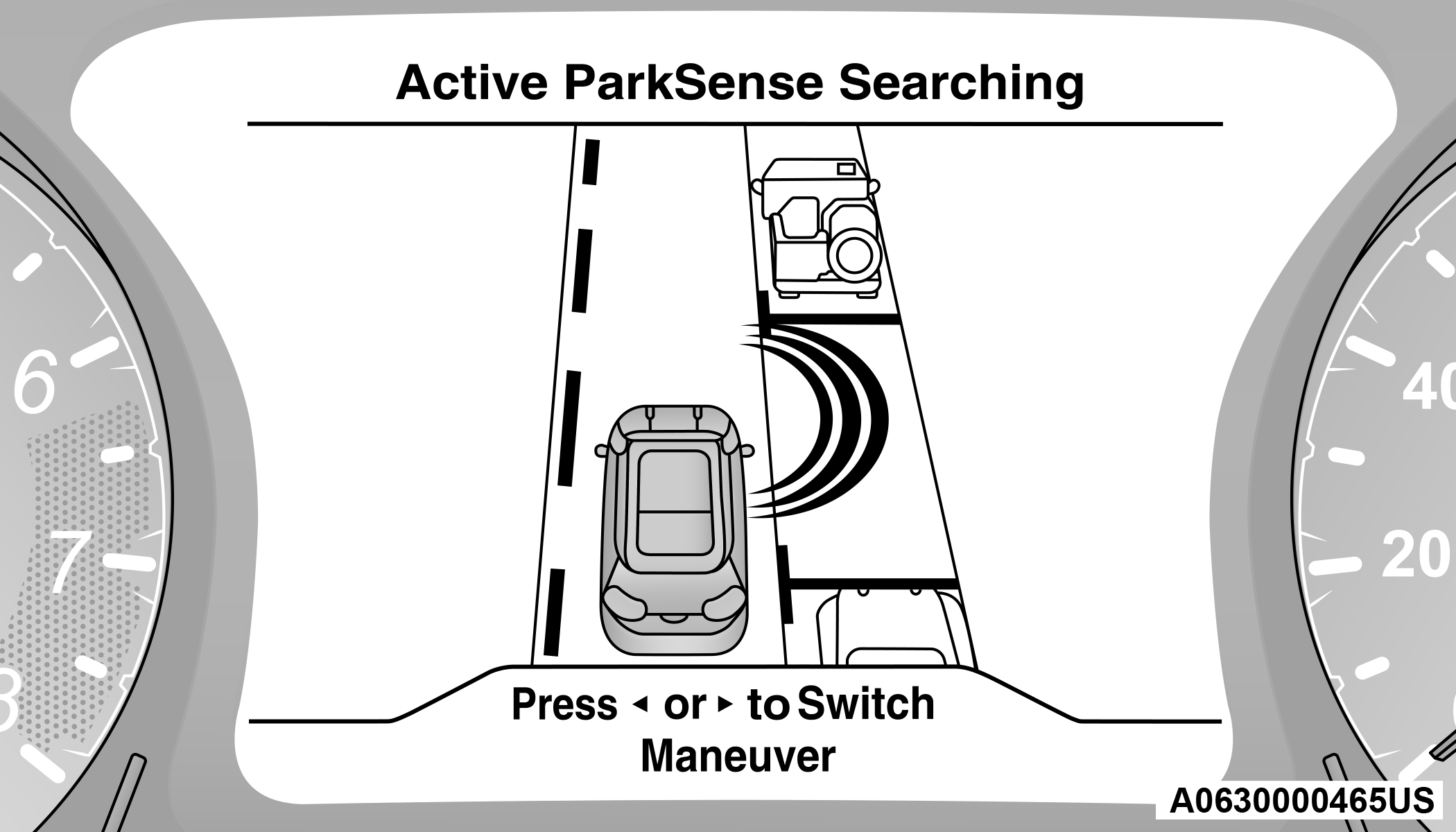 The ParkSense Active Park Assist system is intended to assist the driver during parallel, perpendicular, and parallel park exit maneuvers by identifying a proper parking space, providing audible/visual instructions, and controlling the steering wheel. The ParkSense Active Park Assist system is defined as “semi-automatic” since the driver maintains control of the accelerator, gear selector and brakes. Depending on the driver's parking maneuver selection, the ParkSense Active Park Assist system is capable of maneuvering a vehicle into a parallel or a perpendicular parking space on either side (i.e., driver side or passenger side), as well as exiting a parallel parking space.