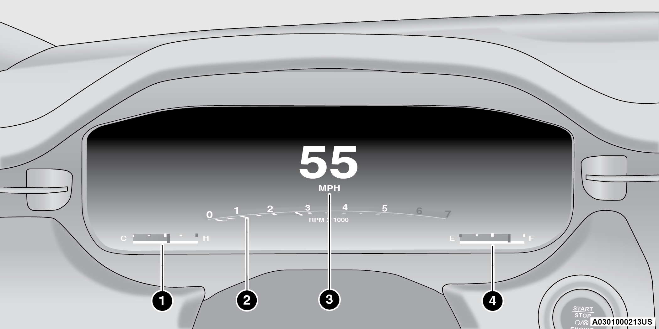 Indicates the engine speed in revolutions per minute (RPM x 1000).