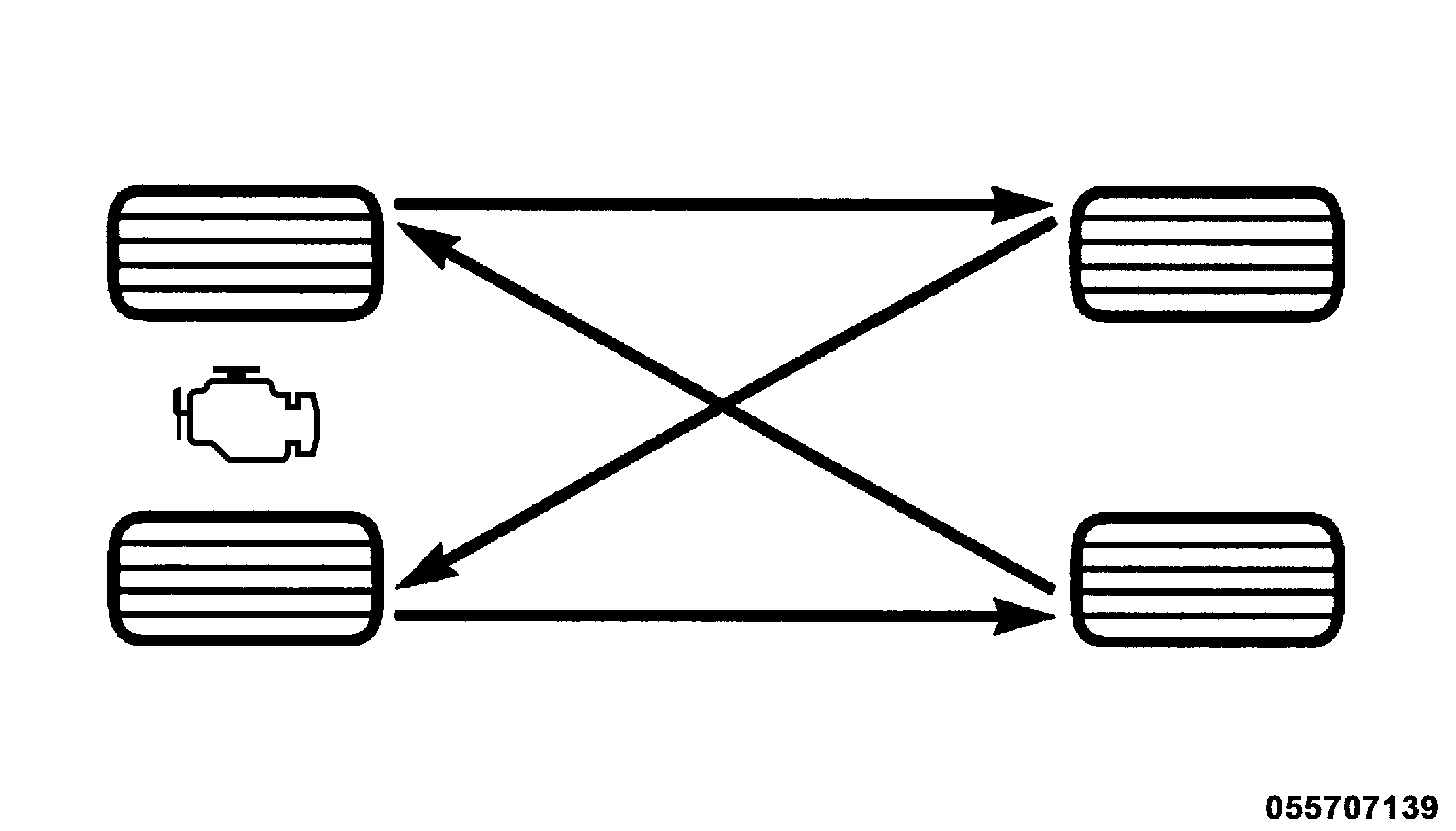 The suggested rotation method is the “forward cross” shown in the following diagram. This rotation pattern does not apply to some directional tires that must not be reversed.