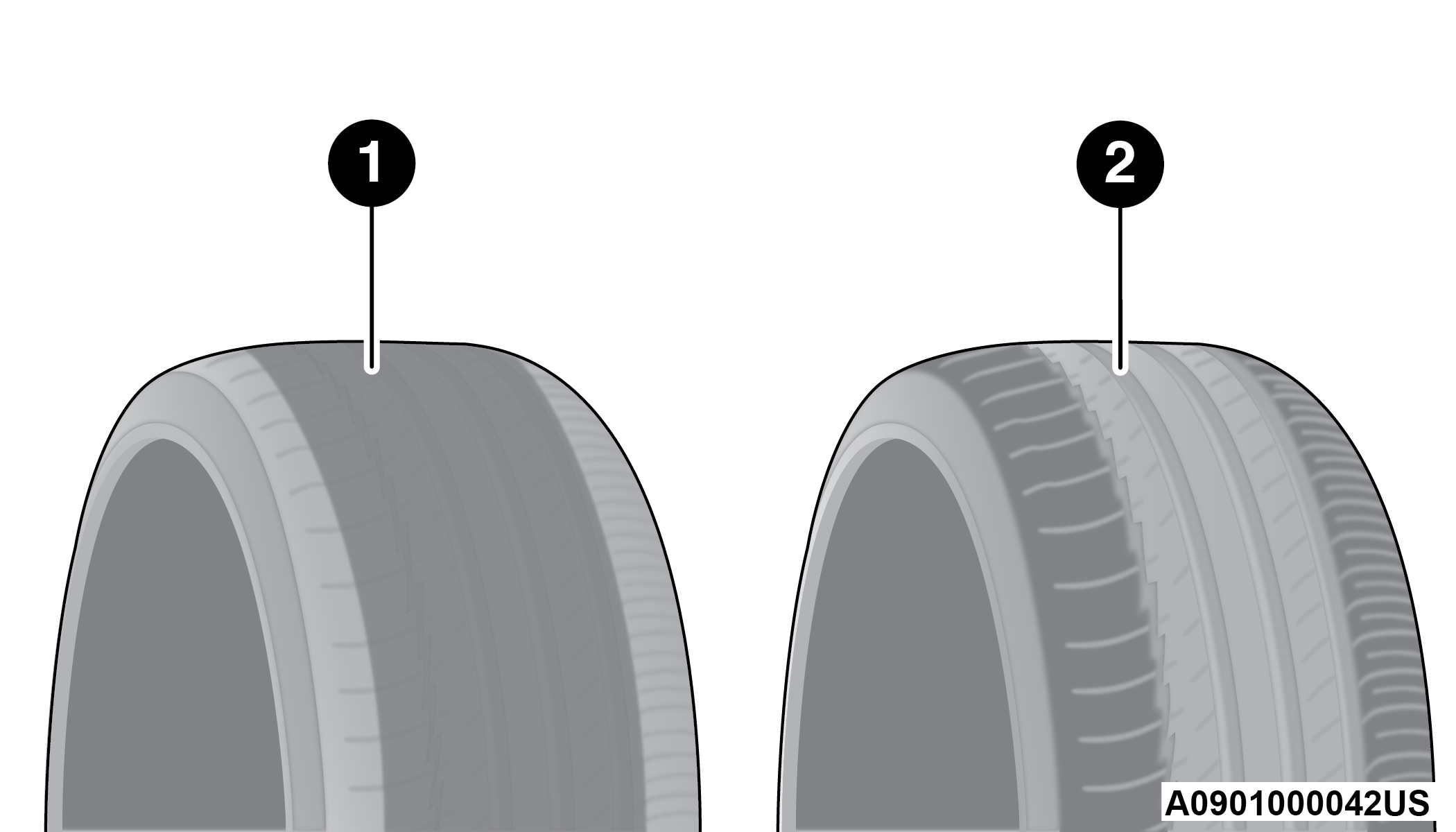 These indicators are molded into the bottom of the tread grooves. They will appear as bands when the tread depth becomes 1/16 of an inch (1.6 mm). When the tread is worn to the tread wear indicators, the tire should be replaced "⇨Replacement Tires".