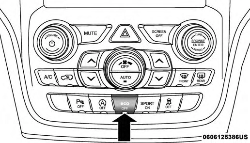 The Fuel Economy (ECO) mode can improve the vehicle’s overall fuel economy during normal driving conditions. Push the “ECO” switch in the center stack of the instru- ment panel to activate or disable ECO mode. A light on the switch indicates when ECO mode is disabled.