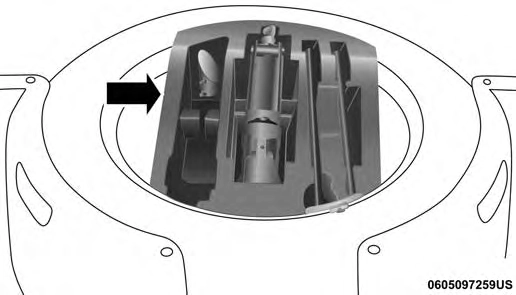 NOTE: The funnel for the Cap-Less Fuel System is located on top of the spare tire. If your vehicle is out of fuel and an auxiliary fuel can is needed, insert the funnel into the filler neck and proceed to fill the vehicle. For vehicles not equipped with a spare tire, the fuel filler funnel is stored in the left storage bin under the load floor. For more informa- tion on the Cap-Less Fuel System, refer to “Refueling The Vehicle” in “Starting And Operating”.