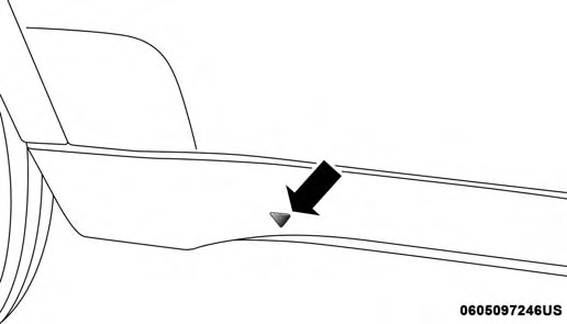 - For the front axle, place the jack on the body flange just behind the front tire as indicated by the triangular lift point symbol on the sill molding. Do not raise the vehicle until you are sure the jack is fully engaged.