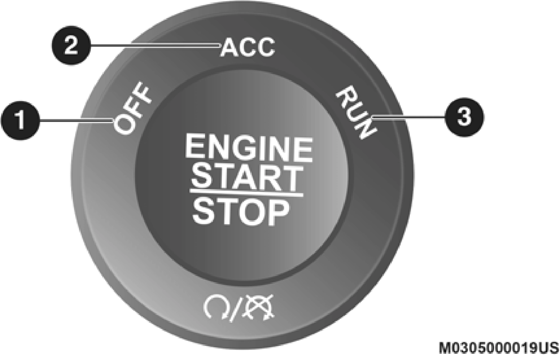 The Keyless Push Button Ignition has several operating modes that are labeled and will illuminate when in position. These modes are OFF, ACC, RUN, and START.