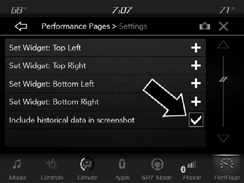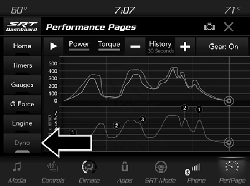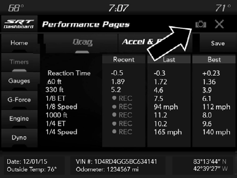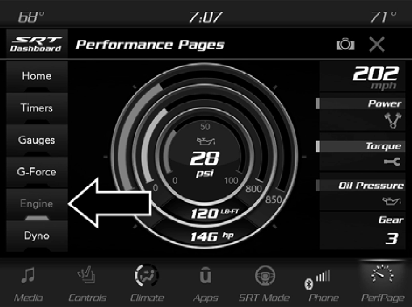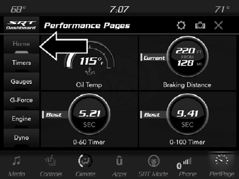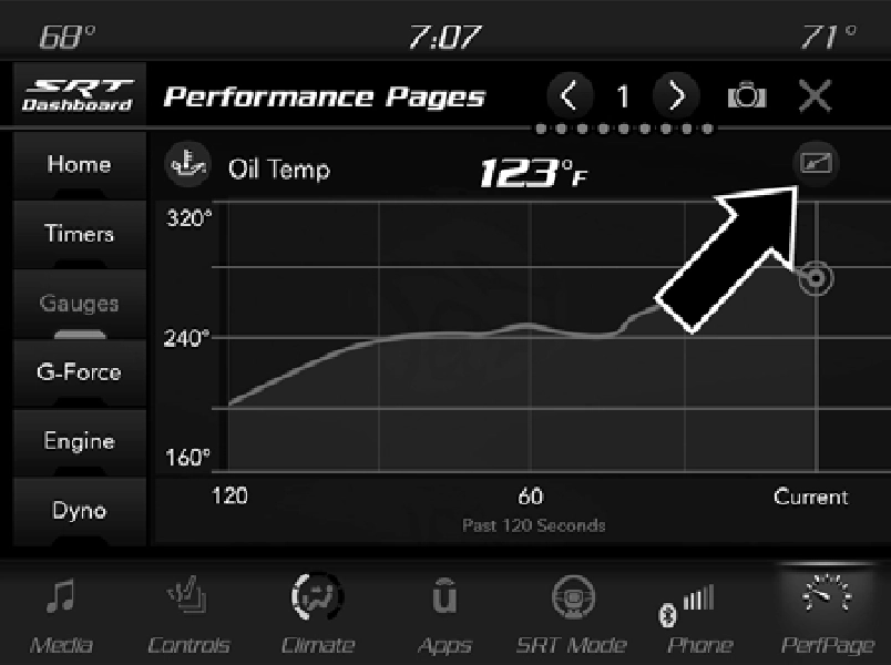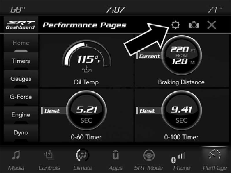 To access the SRT Performance Pages, press the SRT button on the center stack near the gear shifter. Then press the Performance Pages tab on the Dashboard page. Or, from the apps menu, select the Performance Pages app.
