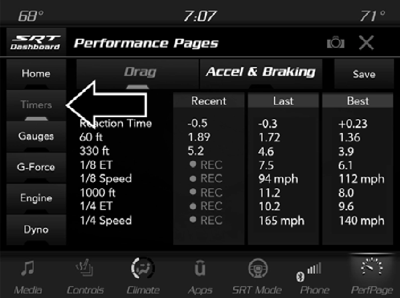 When the Timers Page is selected, you will be able to select the Drag or Accel & Braking tabs. The following will be displayed: