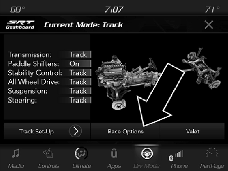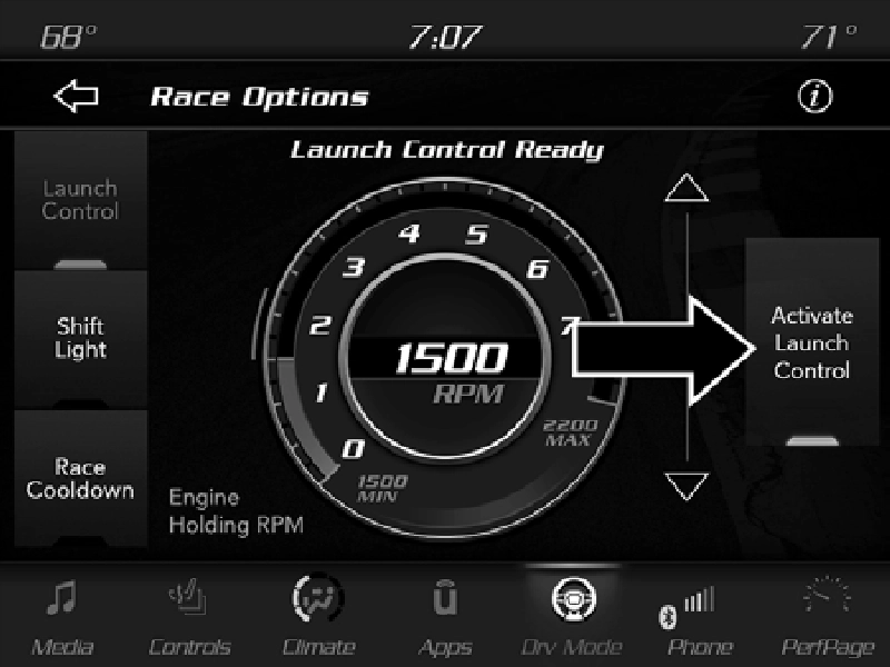 Press the Race Options button on the touchscreen while in the Drive Modes screen to display the vehicle’s Launch