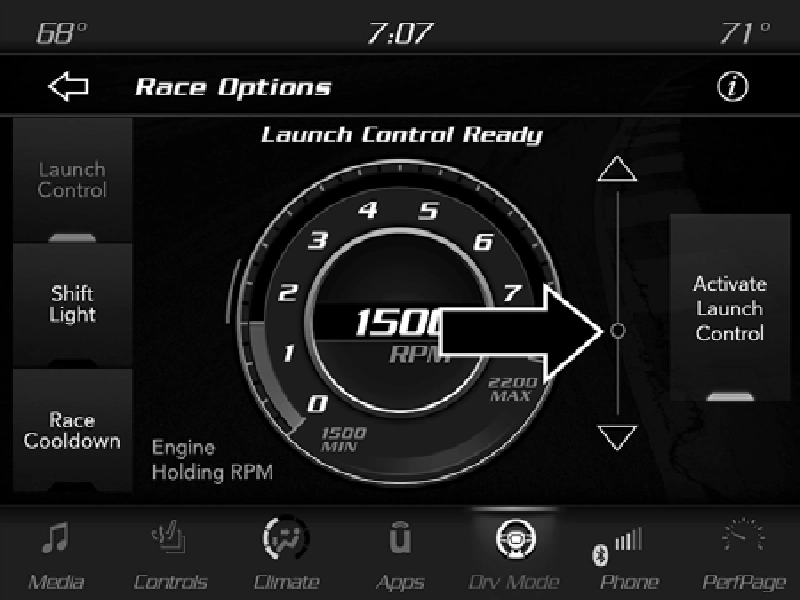 To adjust the Launch RPM, drag the slider bar or press the arrows on the touchscreen to adjust the holding RPM. The launch RPM limit is between the minimum and maximum RPM values shown on the gauge, in 100 RPM increments.