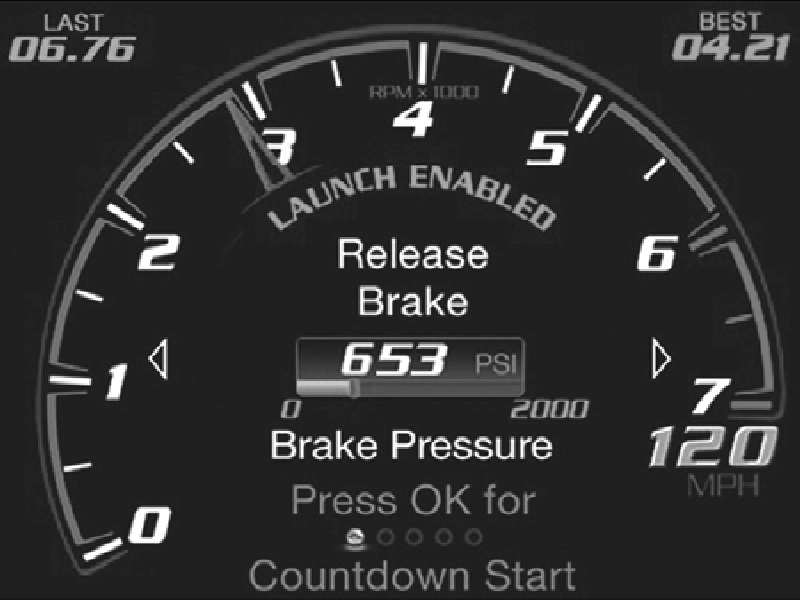 This vehicle is equipped with a Launch Control system that is designed to allow the driver to achieve maximum vehicle acceleration in a straight line. Launch Control is a form of traction control that manages tire slip while launching the vehicle. This feature is intended for use during race events on a closed course where consistent 1/4 mile and 0 to 60 times are desired. The system is not intended to compensate for lack of driver experience or familiarity with the race track. Use of this feature in low traction (cold, wet, gravel, etc.) conditions may results in excess wheel slip outside this systems control resulting in an aborted launch.