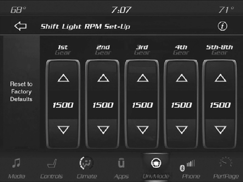 The Shift Light RPM Set-Up allows you to set the shift light to illuminate for gears 1, 2, 3, 4, and 5-8. Pressing and releasing the Up/Down arrow buttons above and below each listed gear, the RPM values will change in increments of 250 RPM. The Shift Light Set-Up screen may only be accessed if the feature is enabled, press the Reset to Factory Default button on the touchscreen to change back to factory settings, or press the Shift Light Off button on the touchscreen to turn the system off completely.