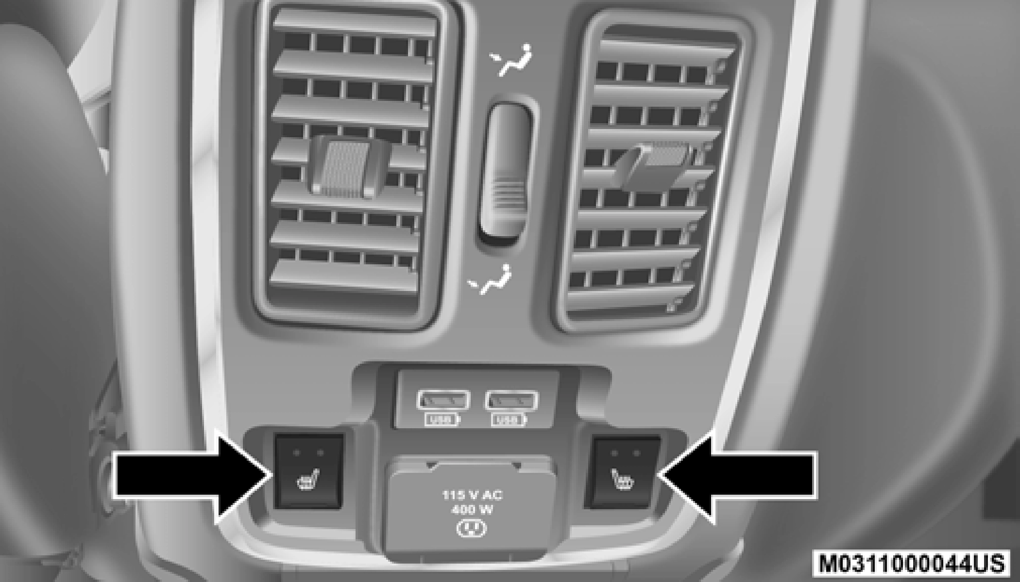 On some models, the two rear outboard seats may be equipped with heated seats. There are two heated seat switches that allow the rear passengers to operate the seats independently. The heated seat switches for each heater are located on the rear of the center console.