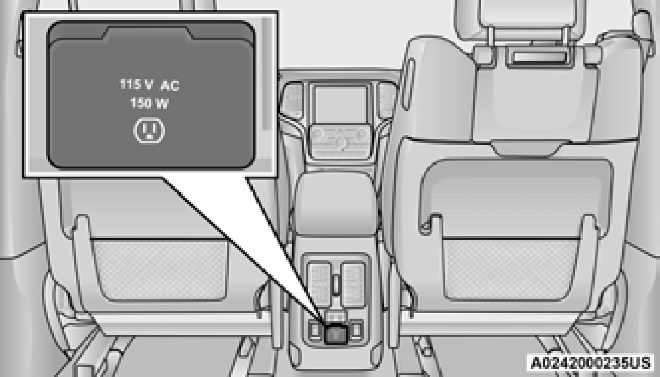 There is a 115 Volt, 150 Watt inverter outlet located on the back of the center console to convert DC current to AC current. This outlet can power cellular phones, electronics and other low power devices requiring power up to 150 Watts.