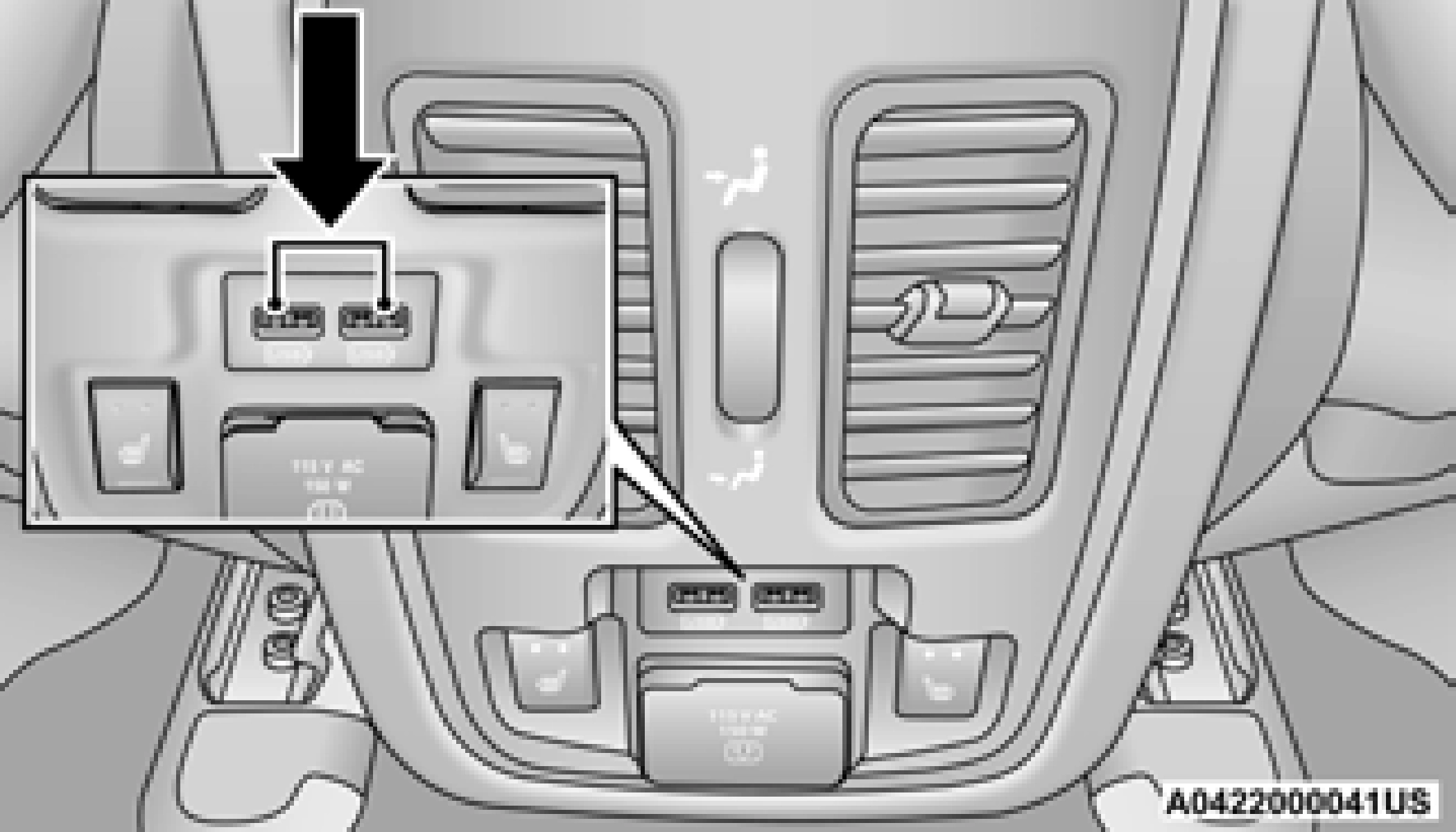 Second row USB connector ports can be used for charging purposes only. Use the connection cable to connect an external USB device to the charging ports which are located on the rear of the center console.