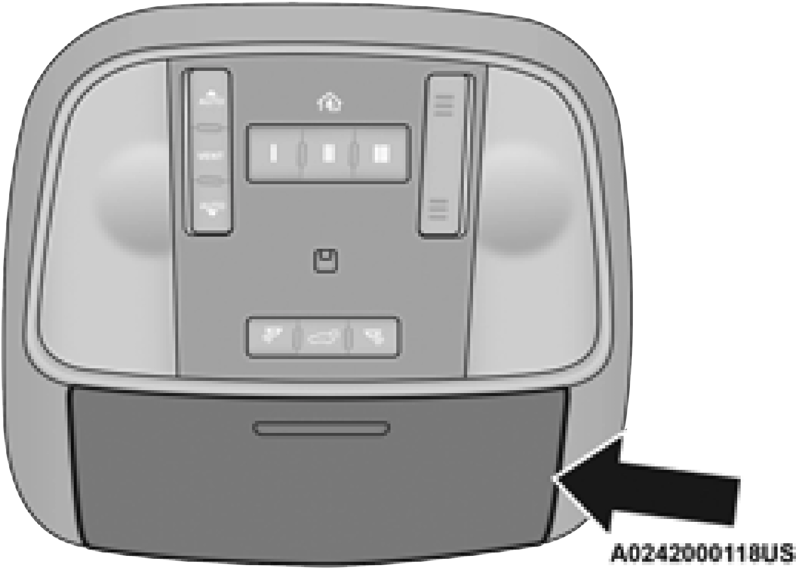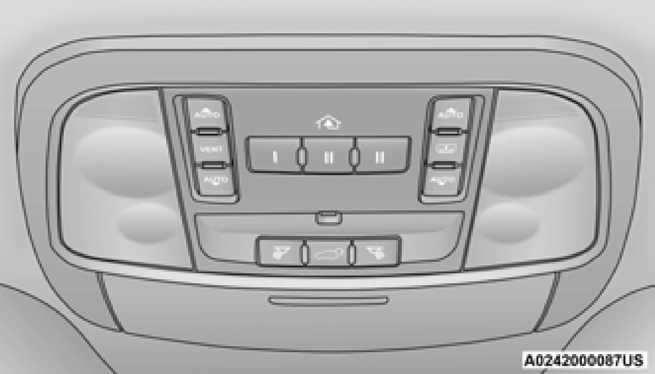 The overhead console contains courtesy/ reading lights and storage for sunglasses. Universal Garage Door Opener (HomeLink®), power liftgate and power sunroof/sunshade switches may also be included, if equipped.
