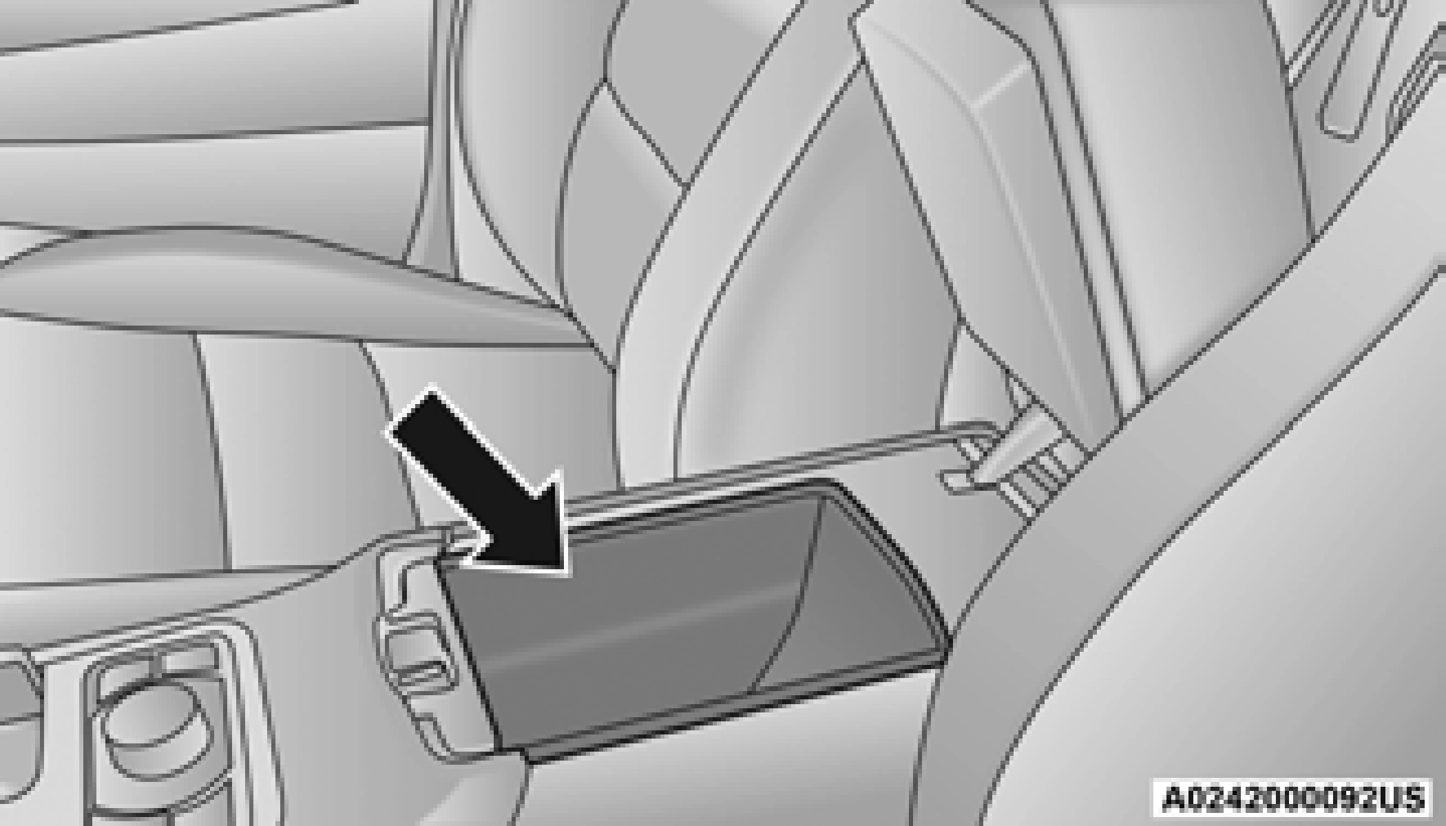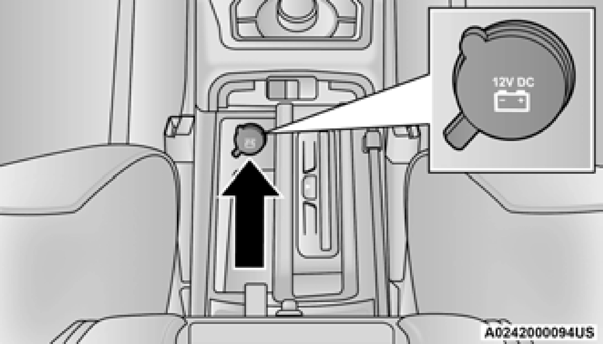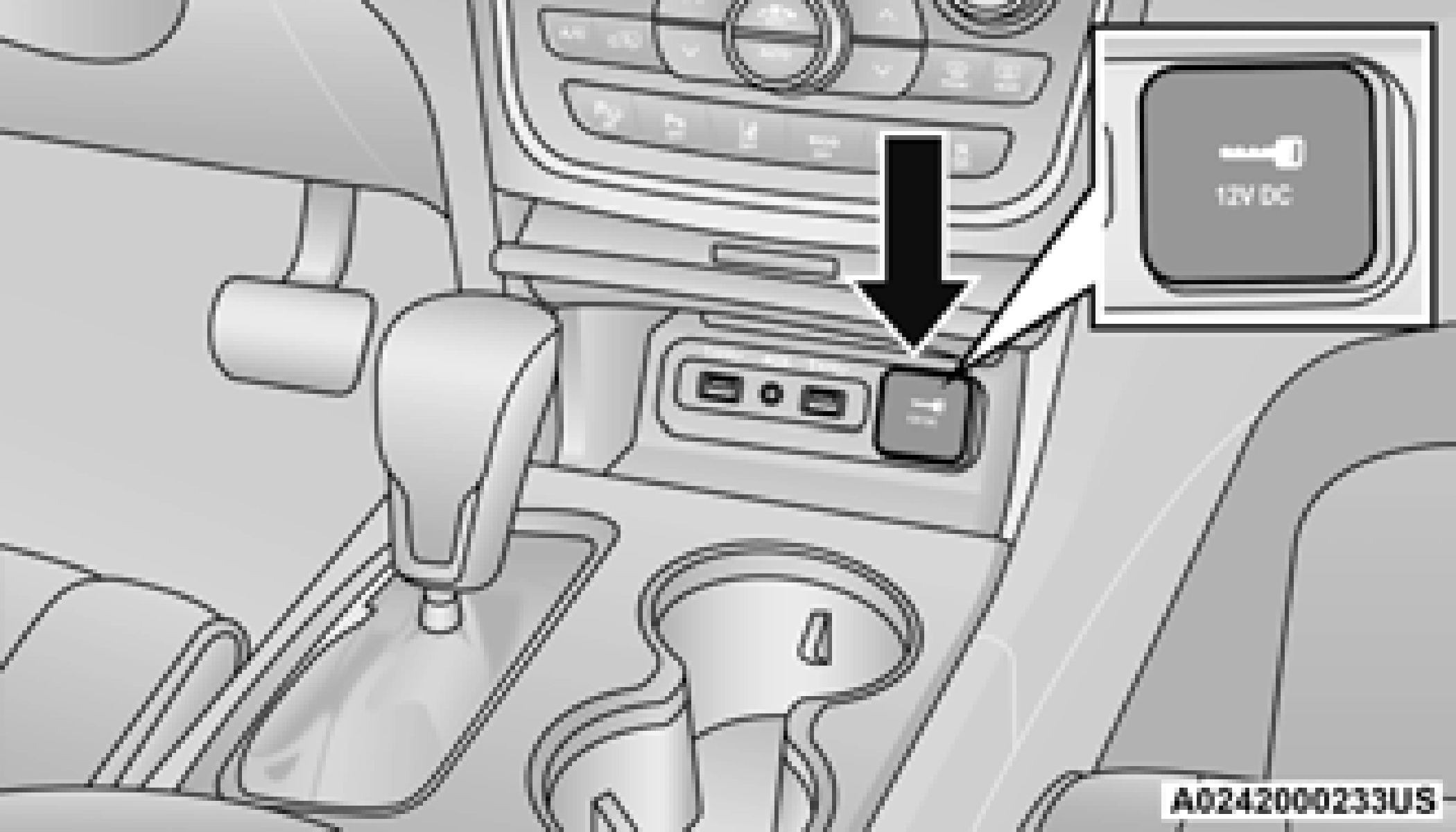 The front power outlet is located inside the storage area on the center stack of the instrument panel. Push inward on the storage lid to open the compartment and gain access to this power outlet.