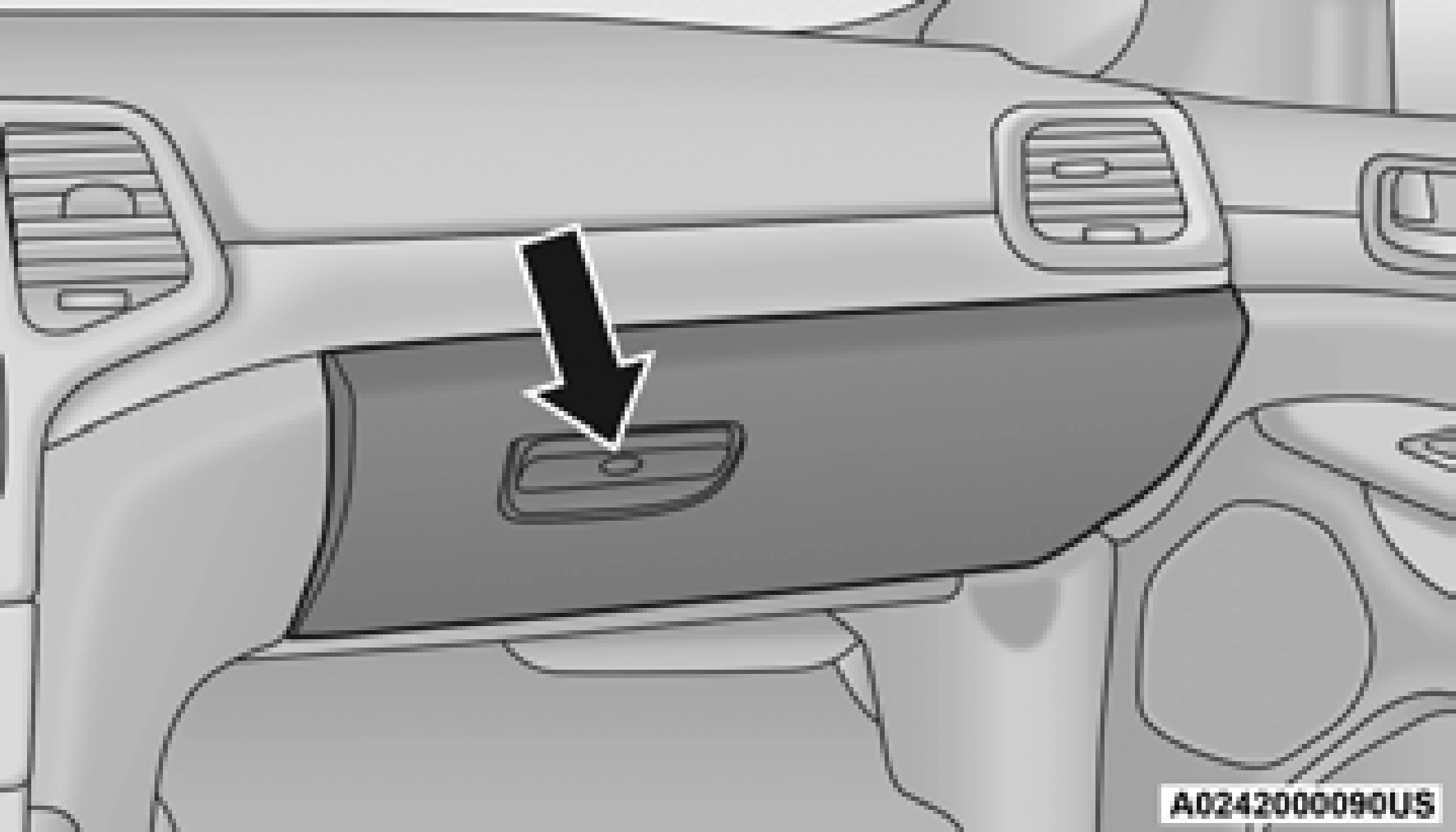 At the front of the console, a compartment is provided for storing a pair of sunglasses. The storage compartment access is a “push/push” design. Push the pad on the door to open. Push the chrome pad on the door to close.