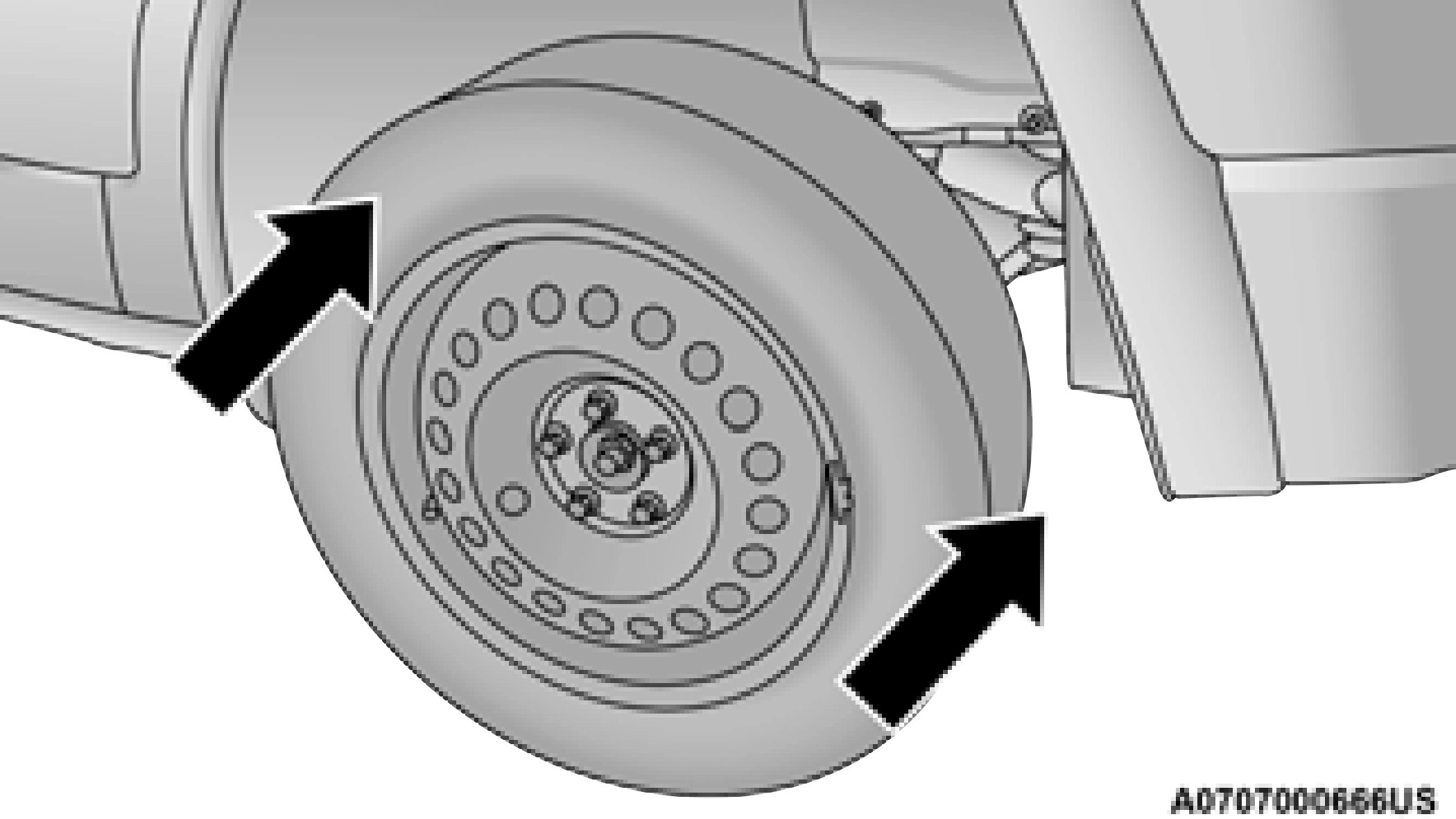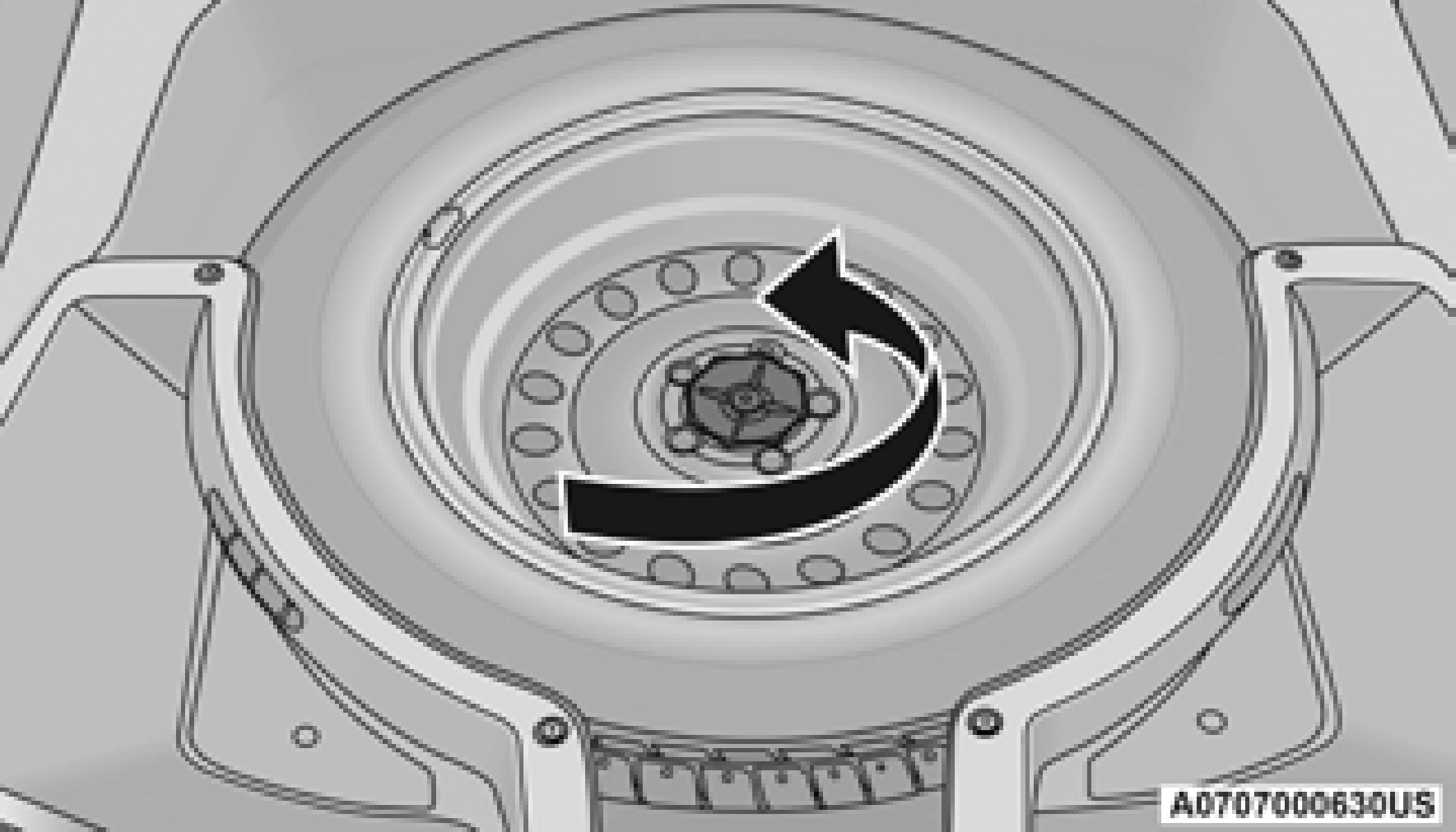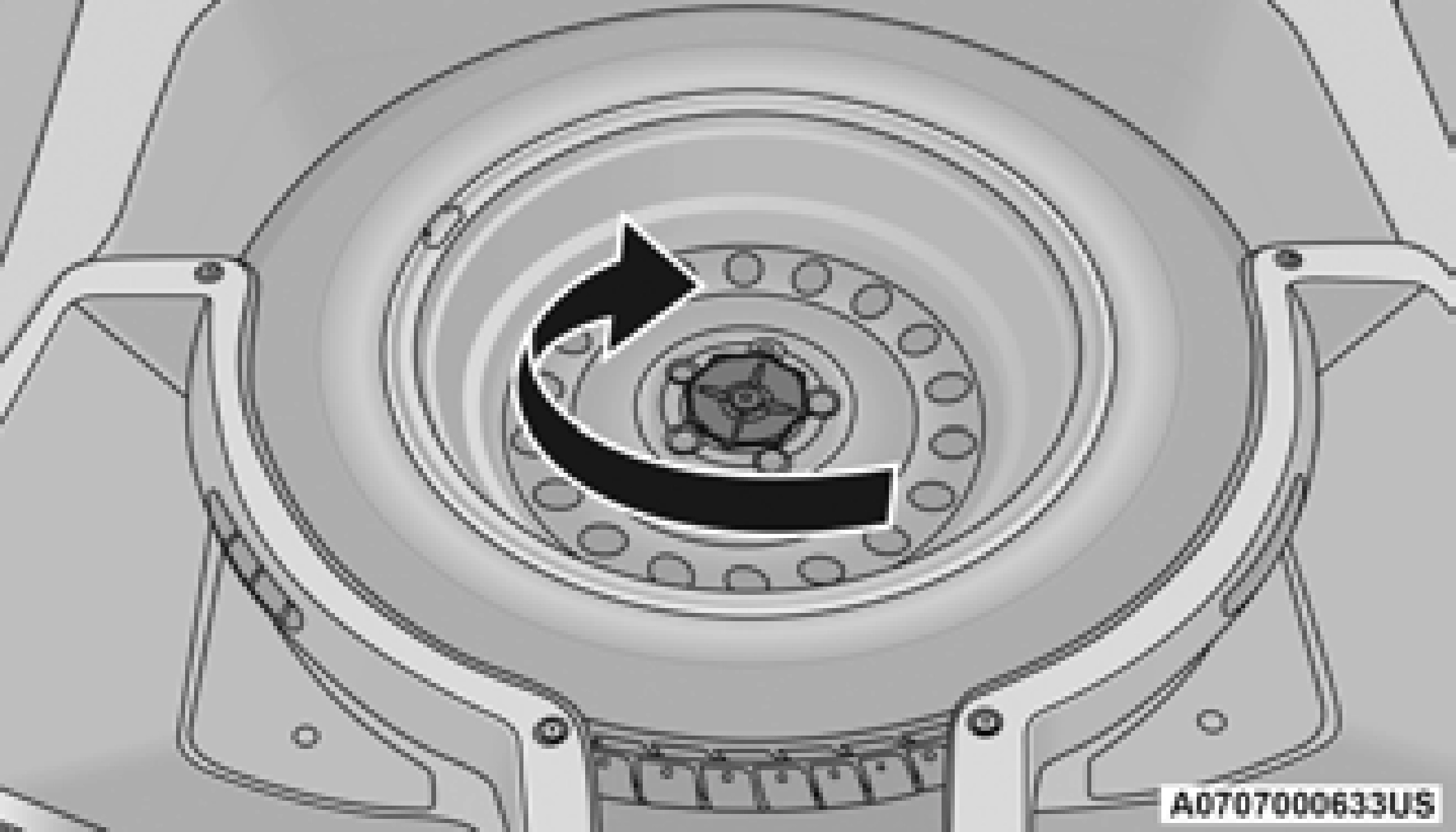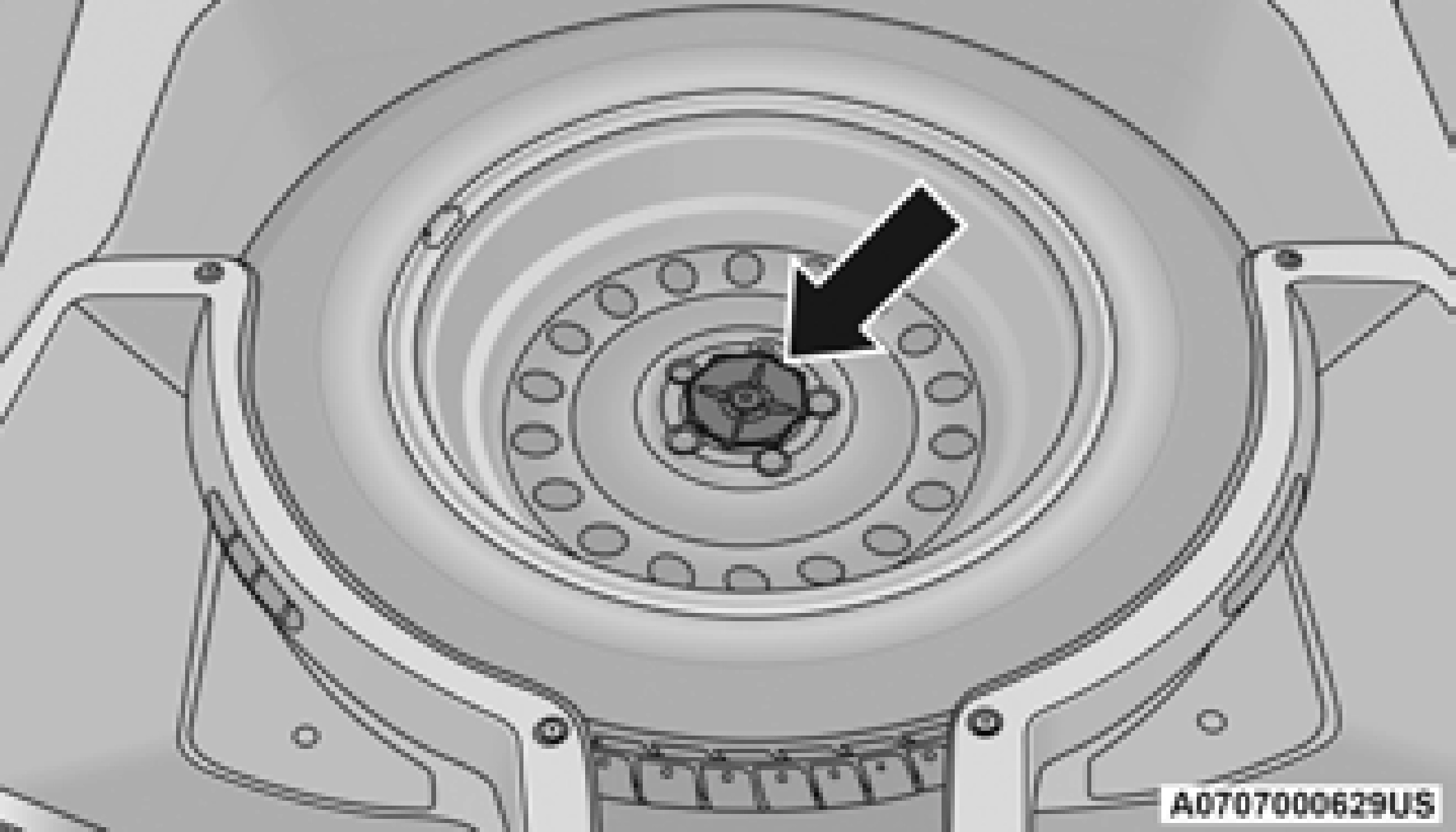 Remove the small center cap and securely store the road wheel in the cargo area. Turn the wing nut clockwise until secured.Do not drive with the spare tire installed for more than 50 miles (80 km) at a max speed of 50 mph (80 km/h).