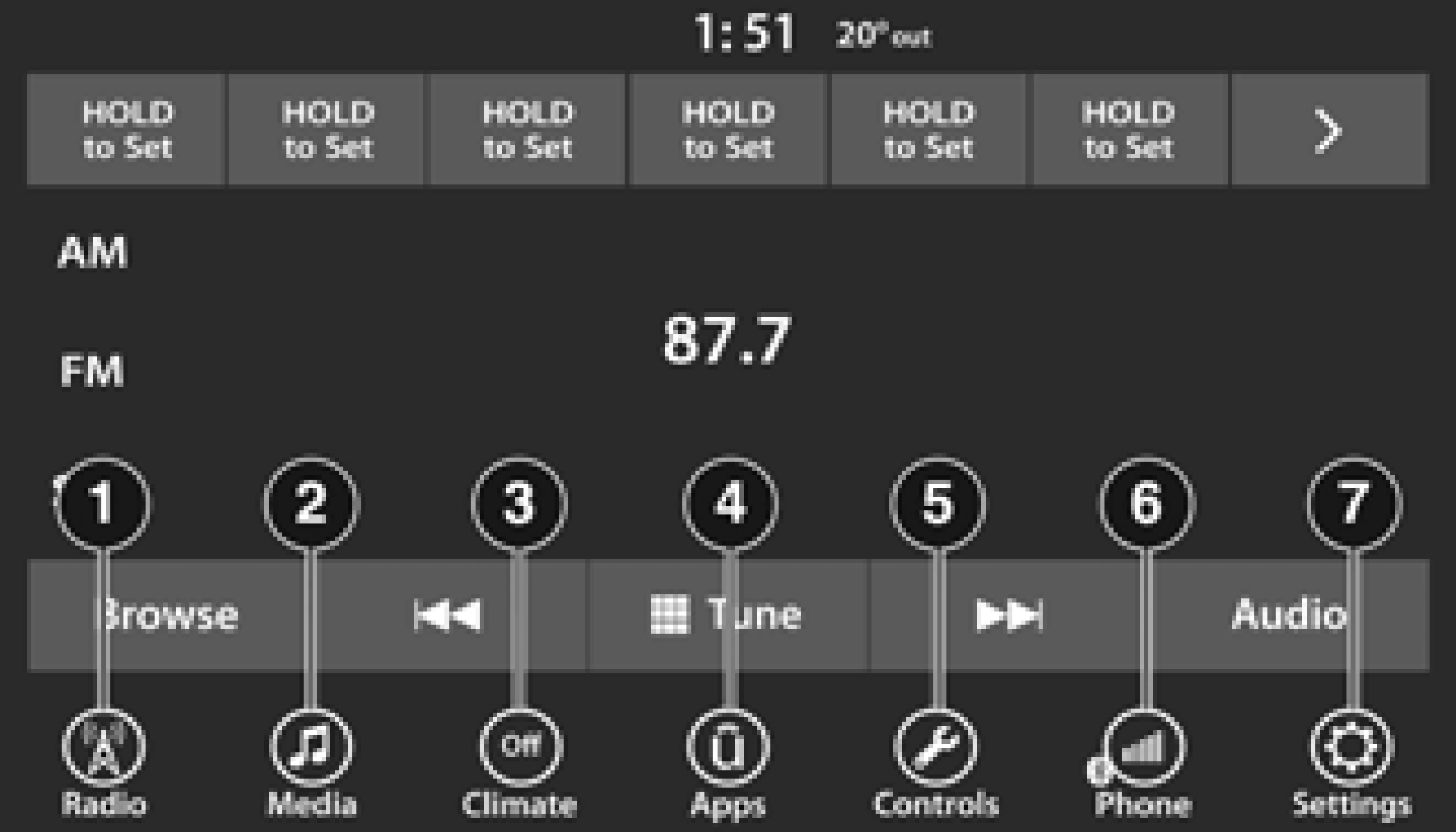 5 — Controls Button 6 — Phone Button 7 — Settings Button