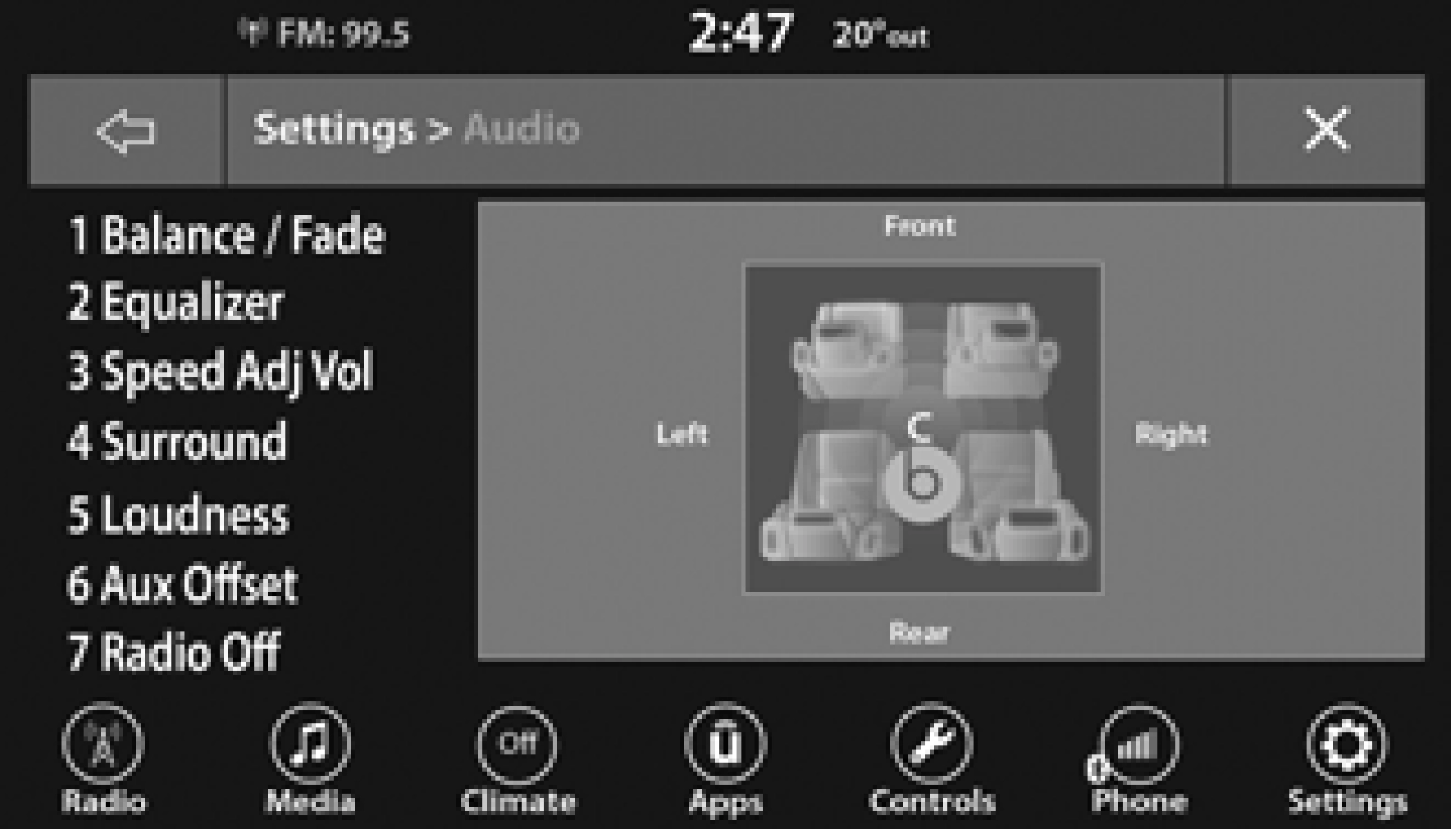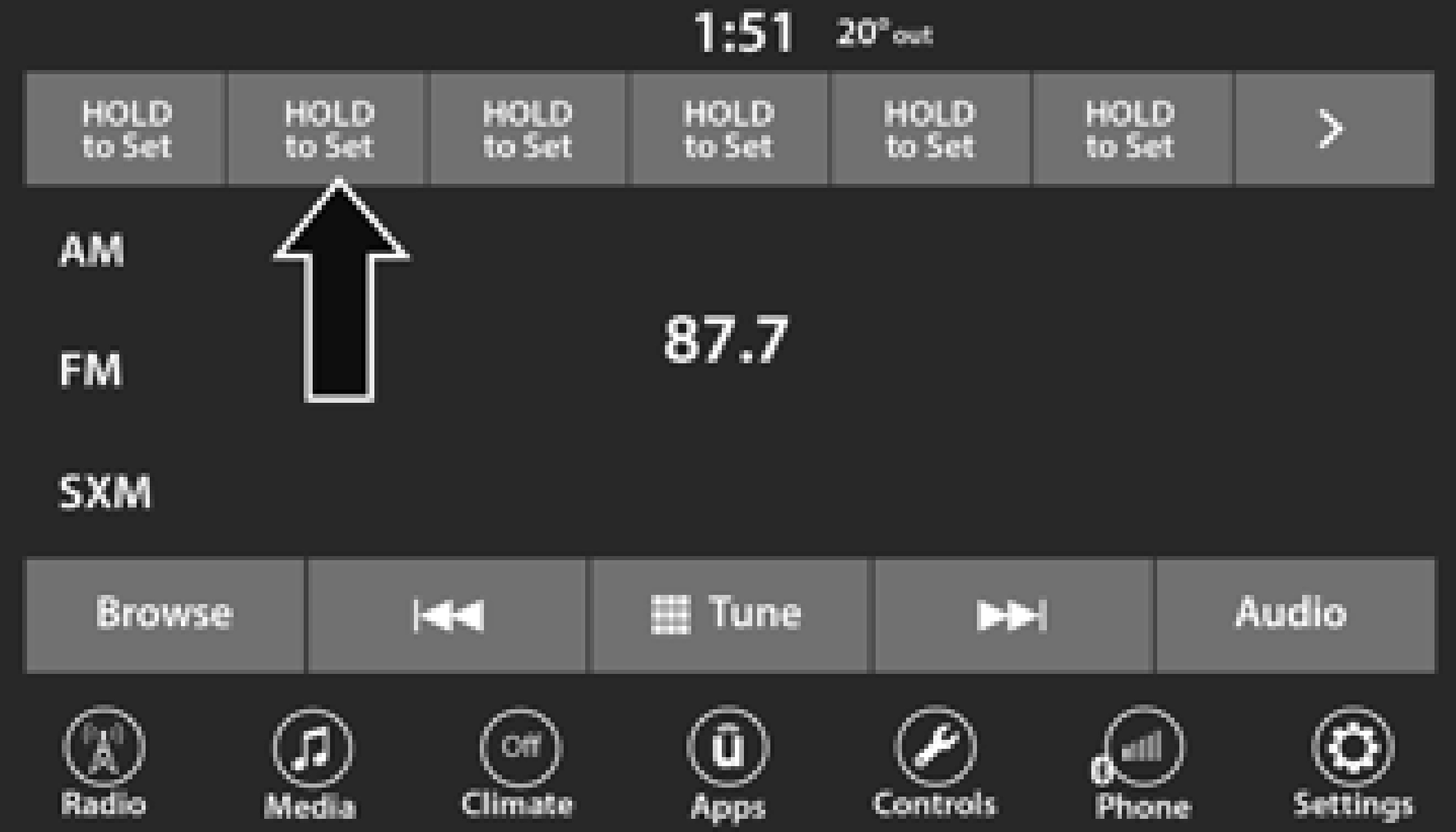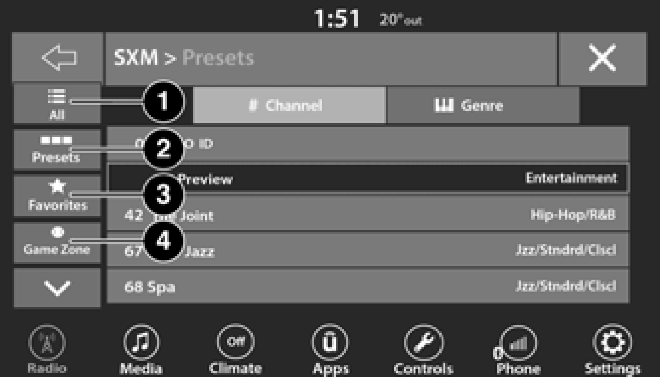 Press the Browse button on the touchscreen to edit Presets, Favorites, Game Zone, and Jump settings, along with providing the SiriusXM® Channel List.