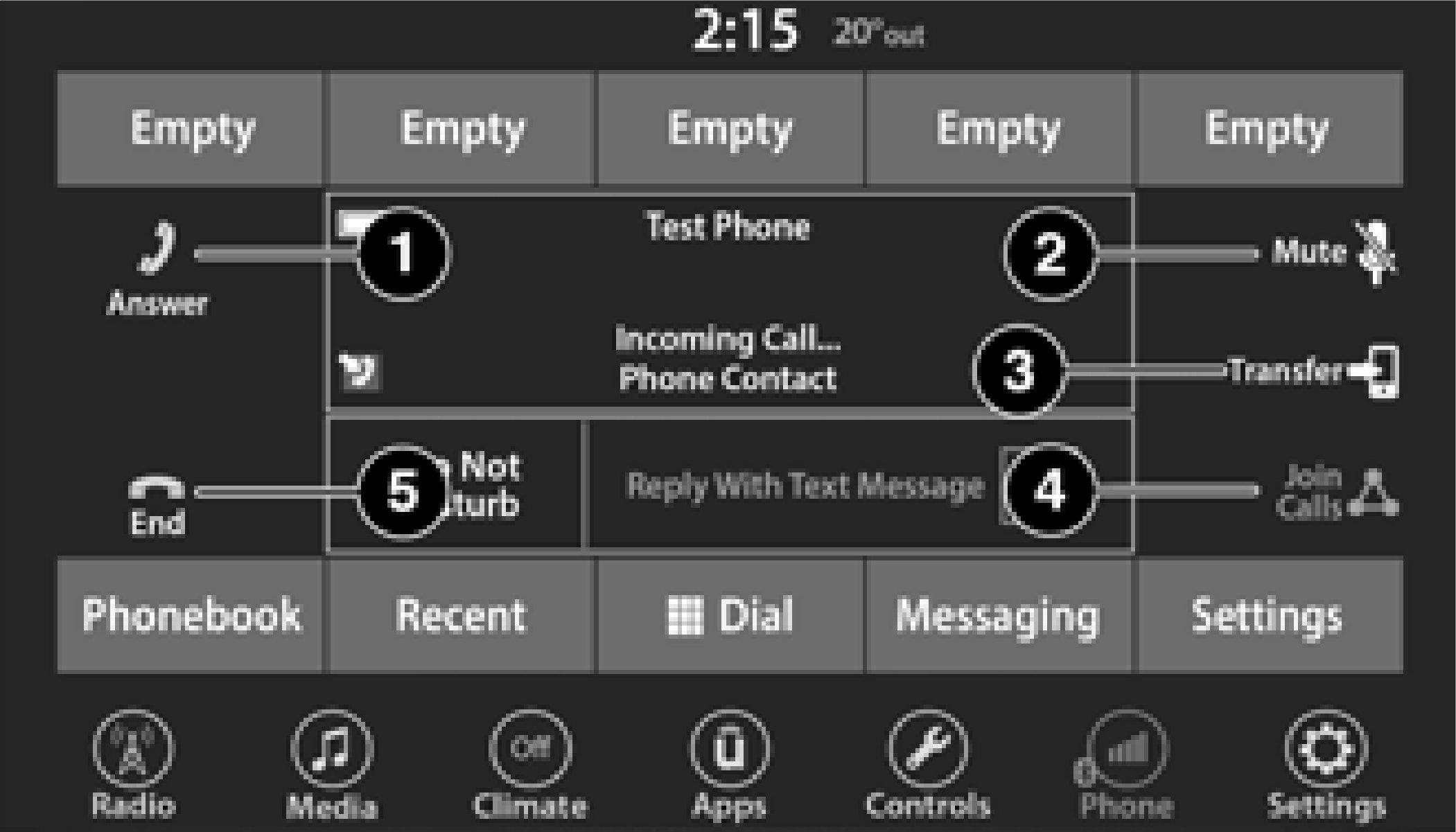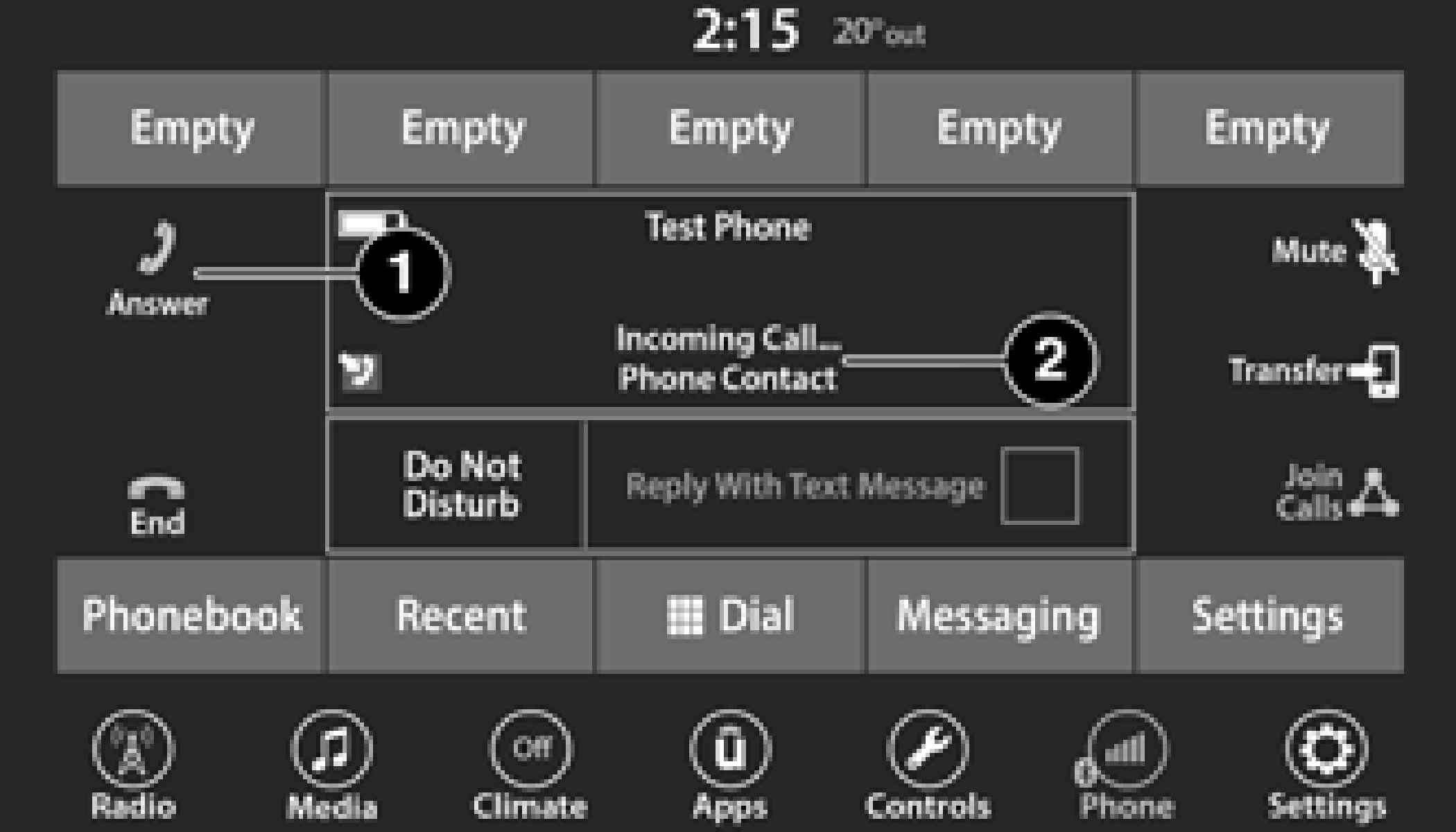 When you receive a call on your mobile phone, the Uconnect Phone will interrupt the vehicle audio system. Push the Phone button on the steering wheel, press the Answer button on the touchscreen.