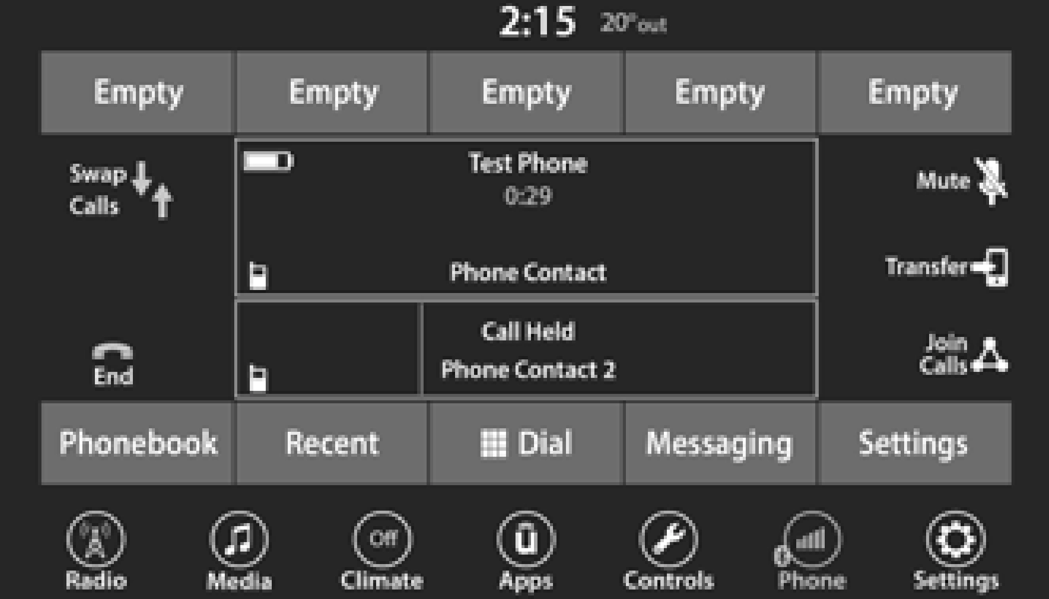 To end a call in progress, momentarily press the End Call button on the touchscreen or the Phone End button on the steering wheel. Only the active call(s) will be terminated and if there is a call on hold, it will become the new active call.