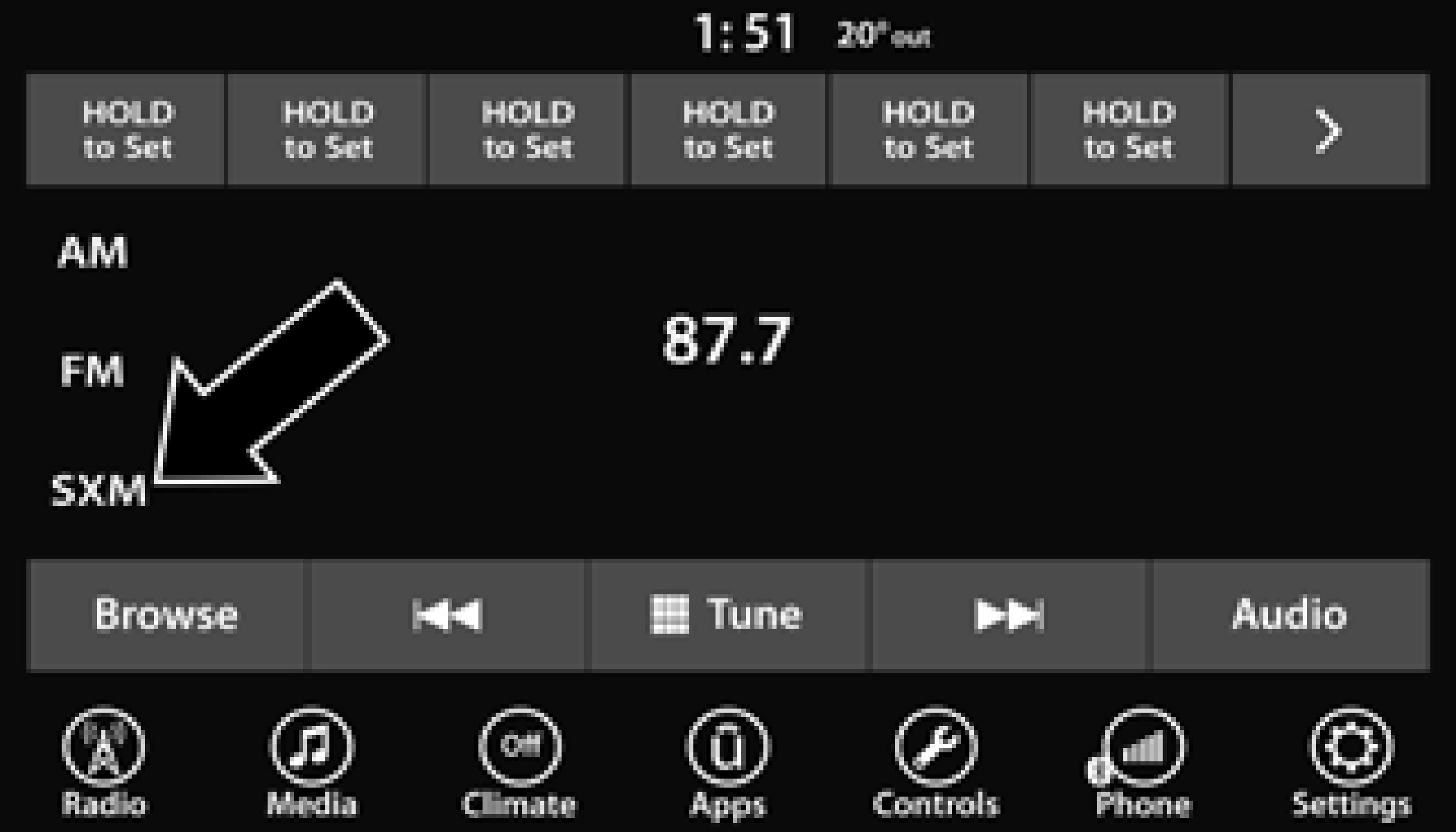 The Satellite Mode is activated by a press of the SXM button on the touchscreen.