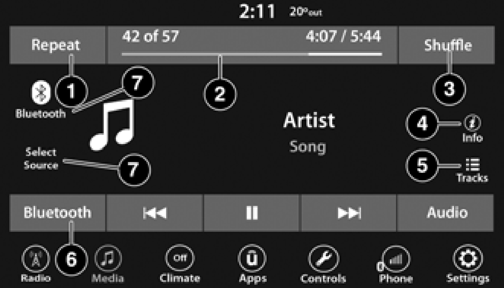 Favorite Song: While the song is playing, to set a favorite song, press the Favorites button on the touchscreen and then the Favorite Song button on the touchscreen.