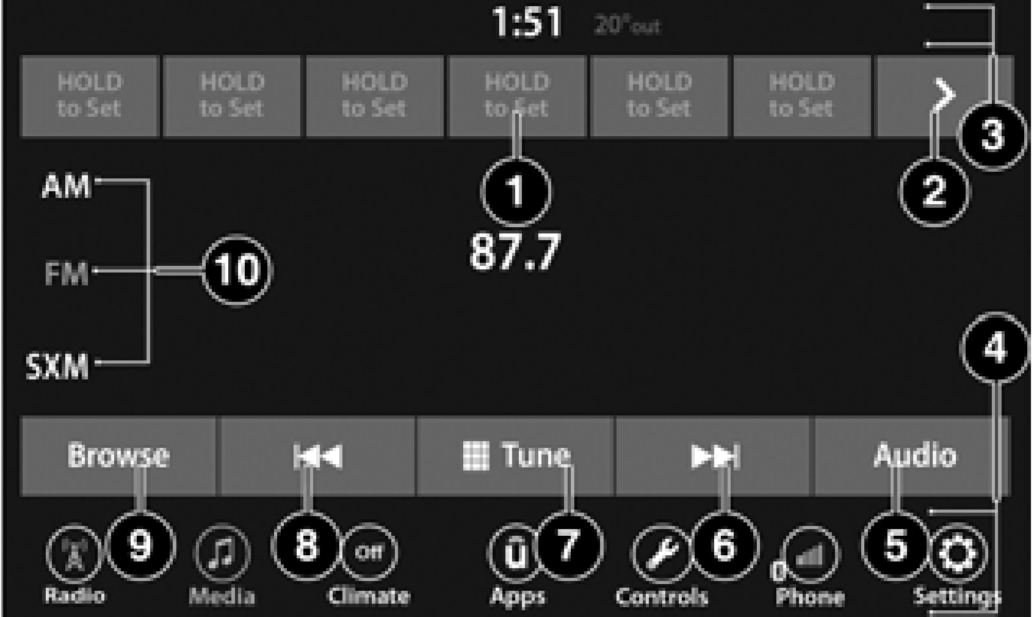— Tune Button 8 — Seek Down9 — Browse Button 10 — Radio Bands
